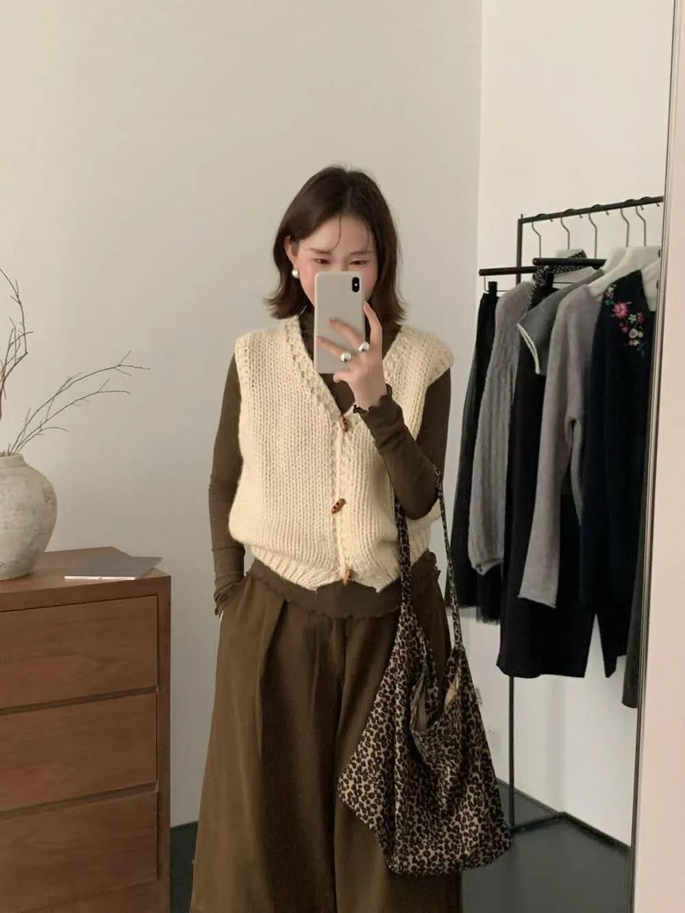 DCS5555 正韓 粗針織v領牛角扣背心F 米杏 $590