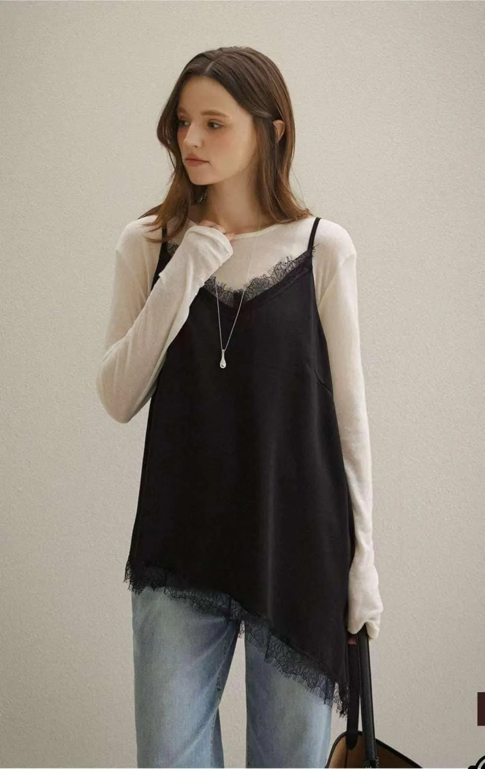 MA644 斜型剪裁睫毛蕾絲細肩上衣F 黑色 $640