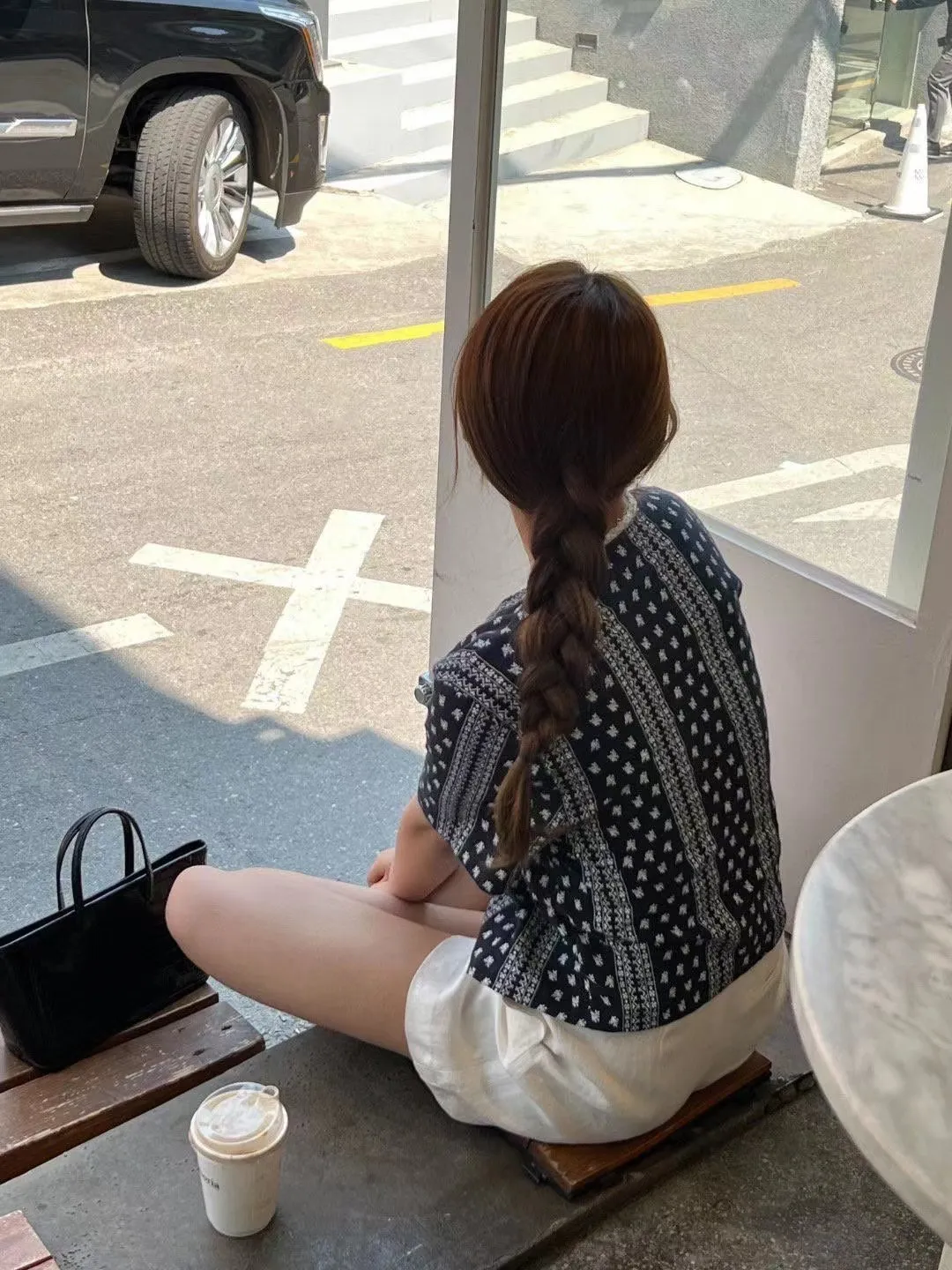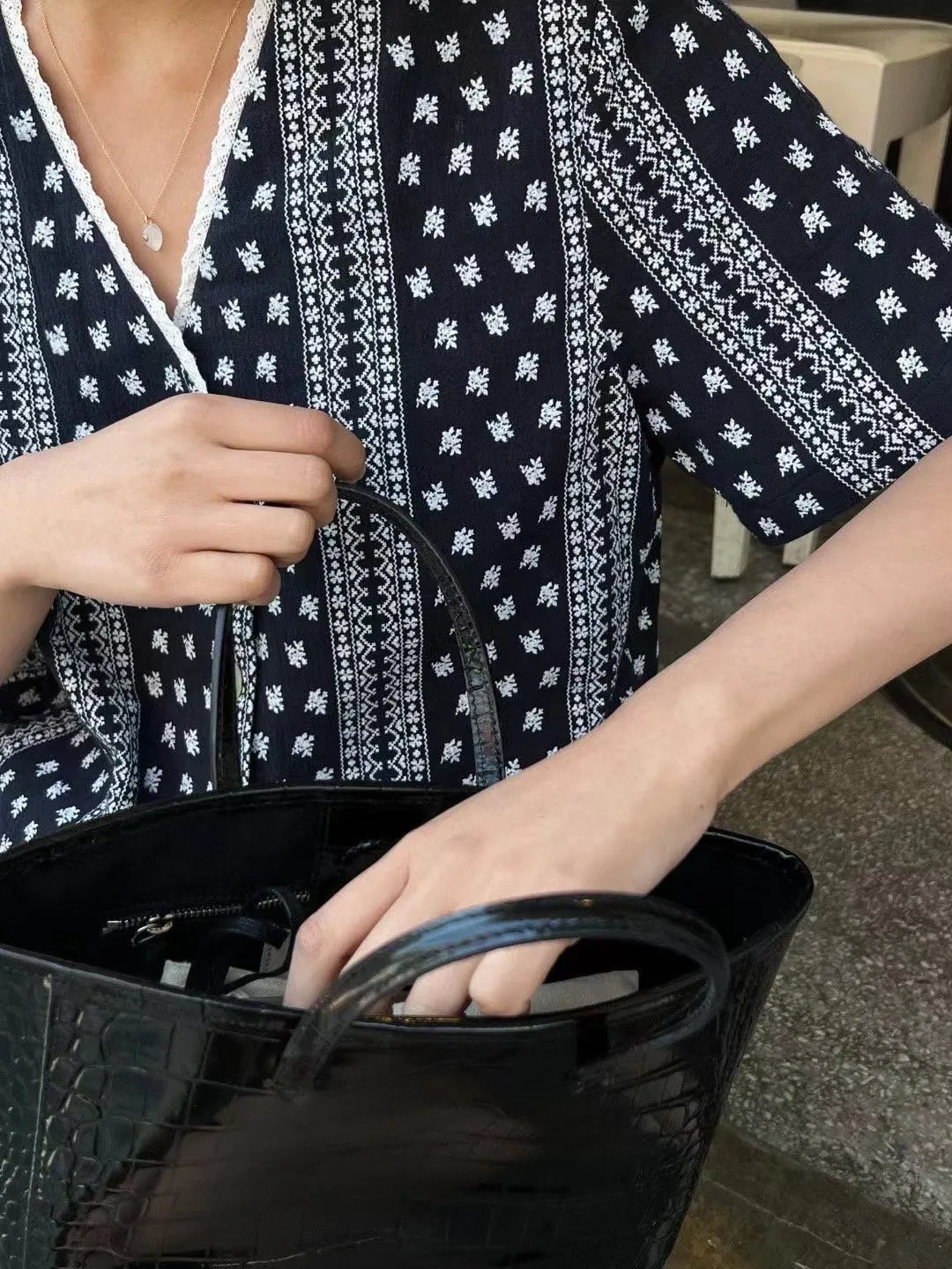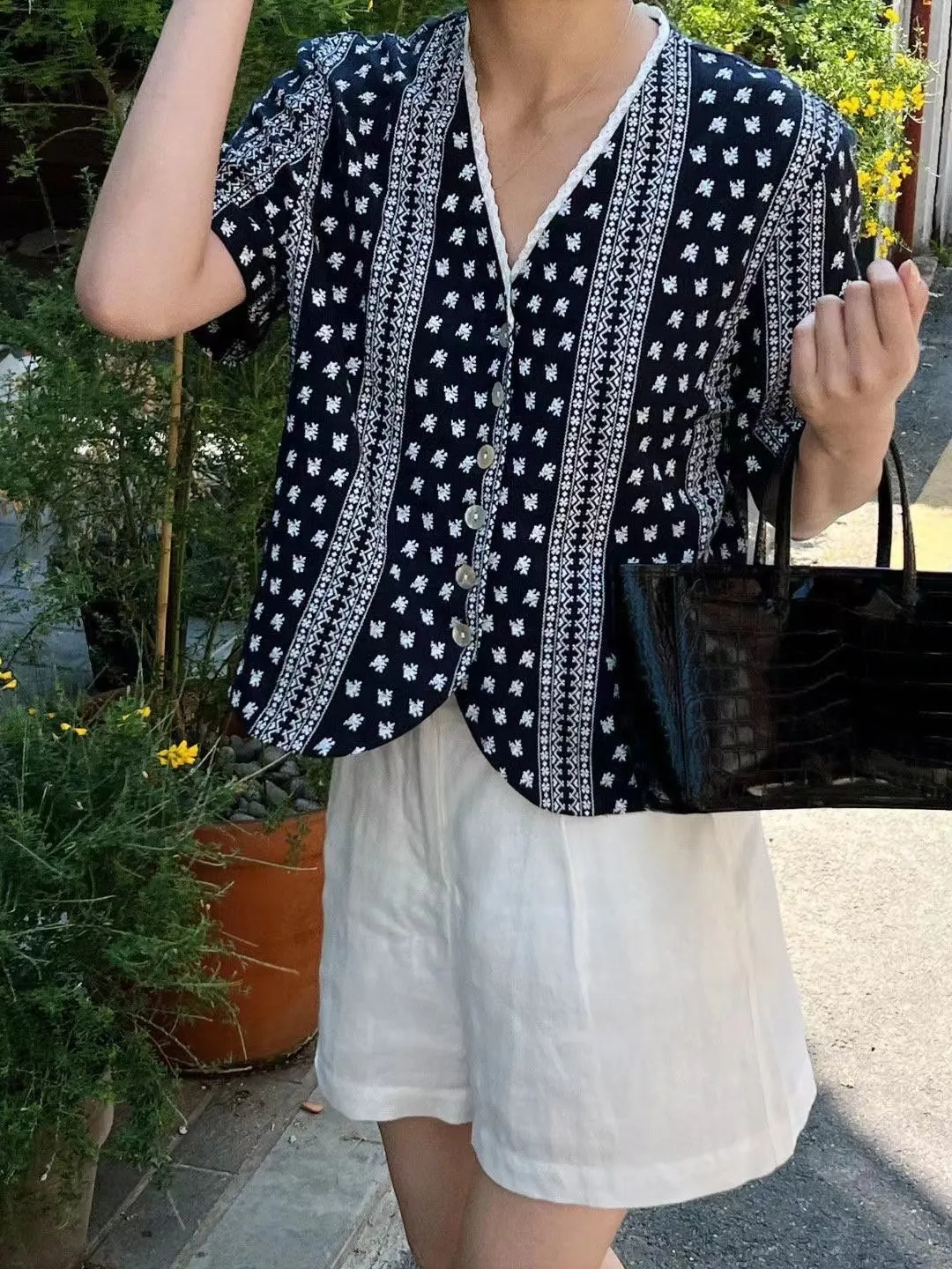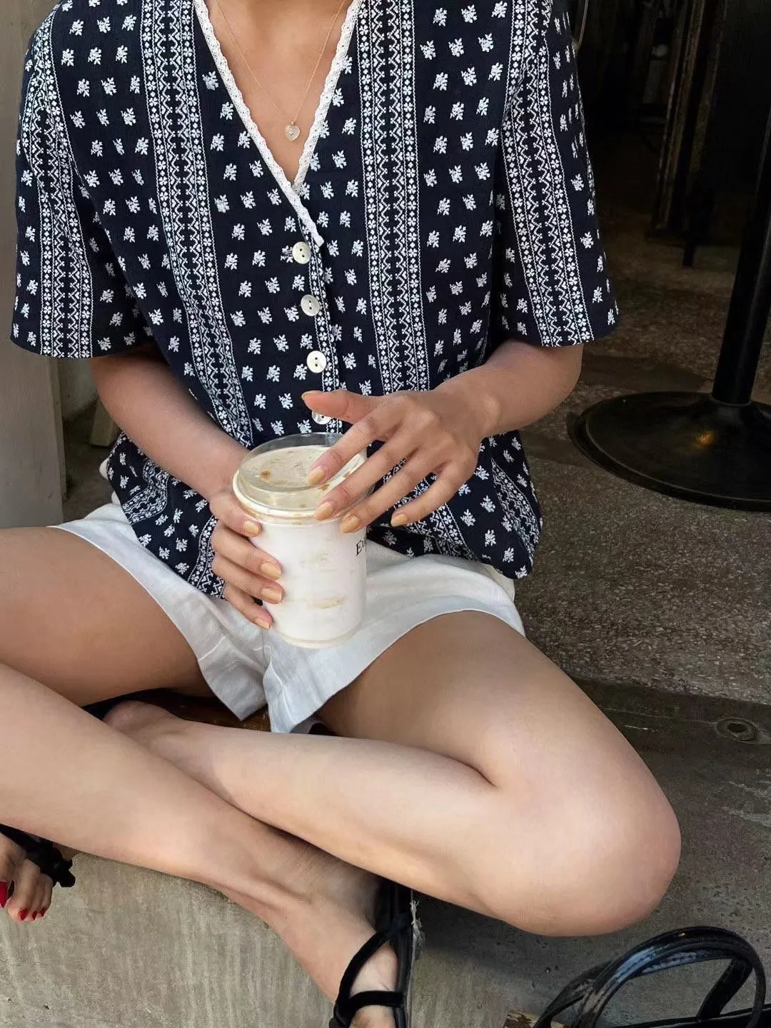 DCS2219 正韓 圖騰印花V領排釦棉衫F 深藍