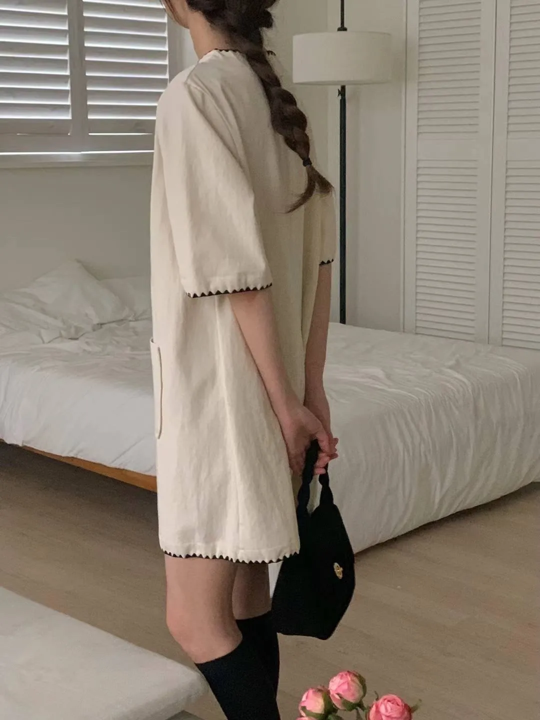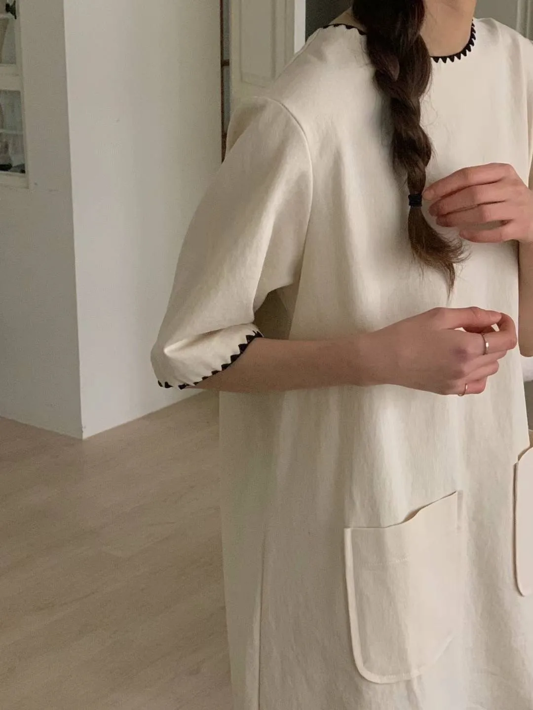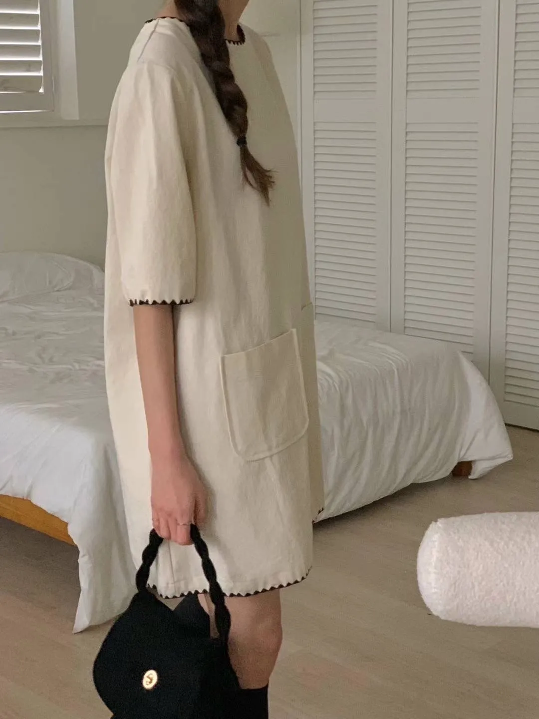 DCS3261 正韓 黑色滾邊口袋棉麻短洋F 米白