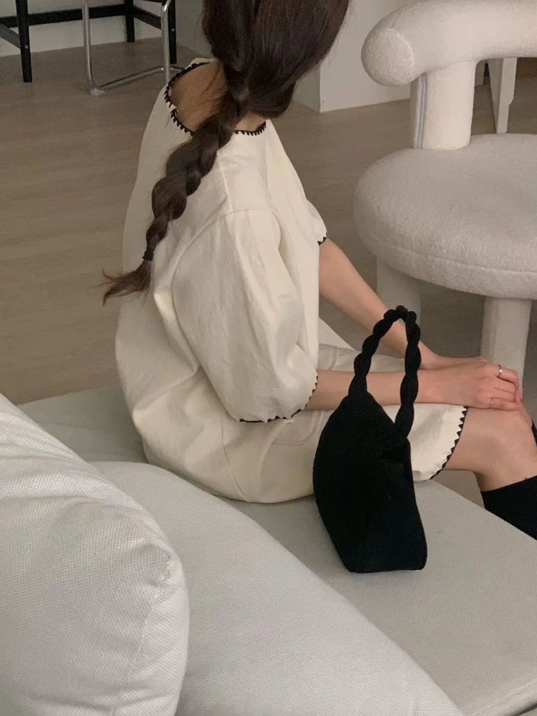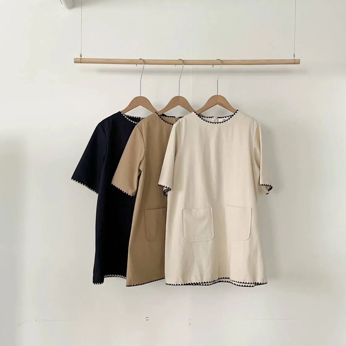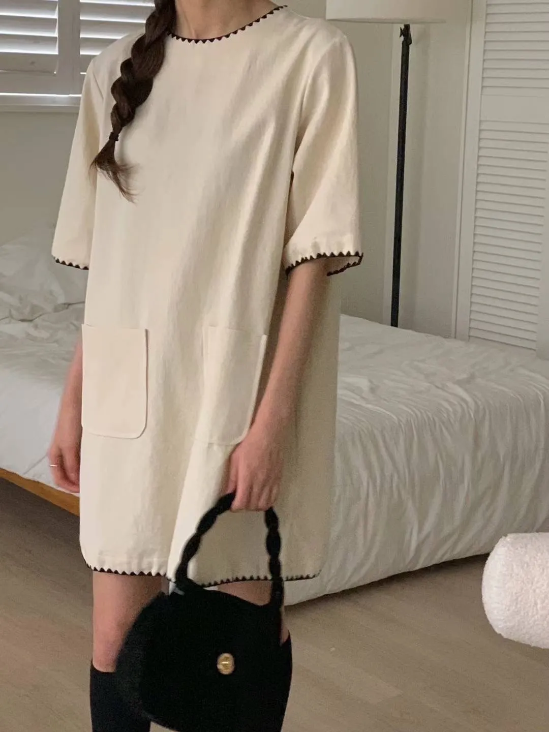 DCS3261 正韓 黑色滾邊口袋棉麻短洋F 米白