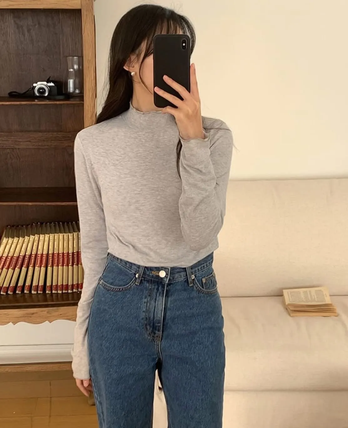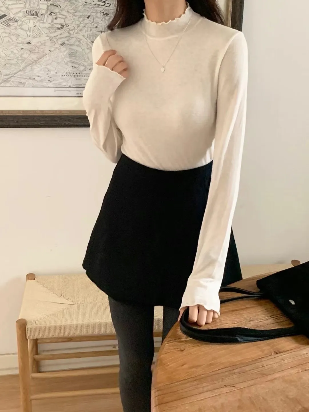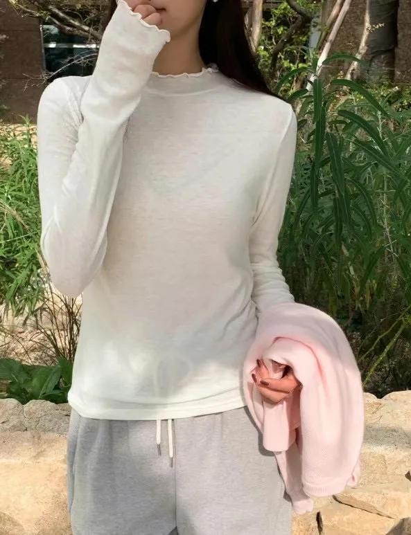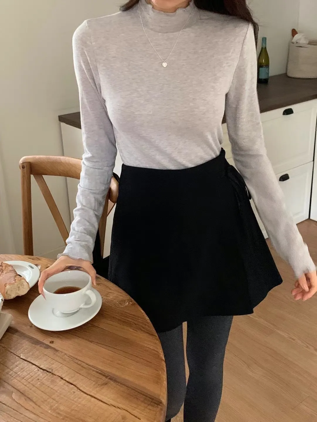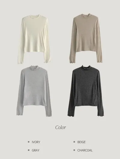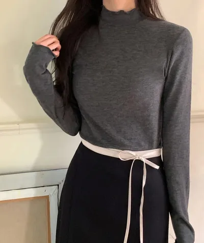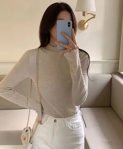 DCS4622 正韓 舒服彈性微高領卷邊打底衫F 米白 淺灰 杏色 黑色
