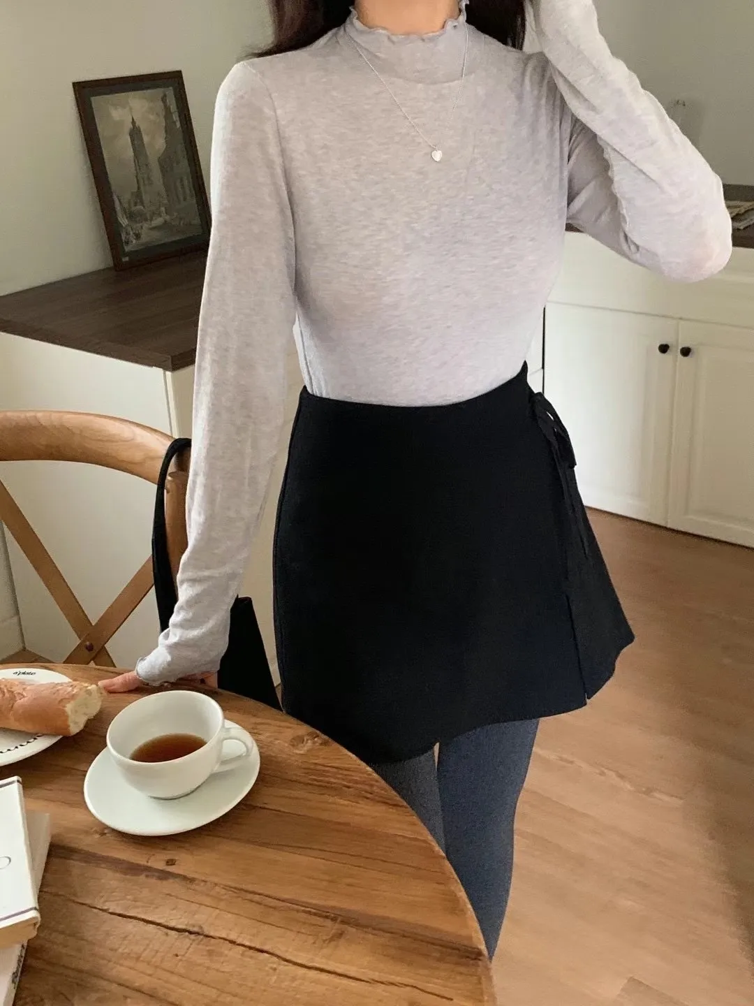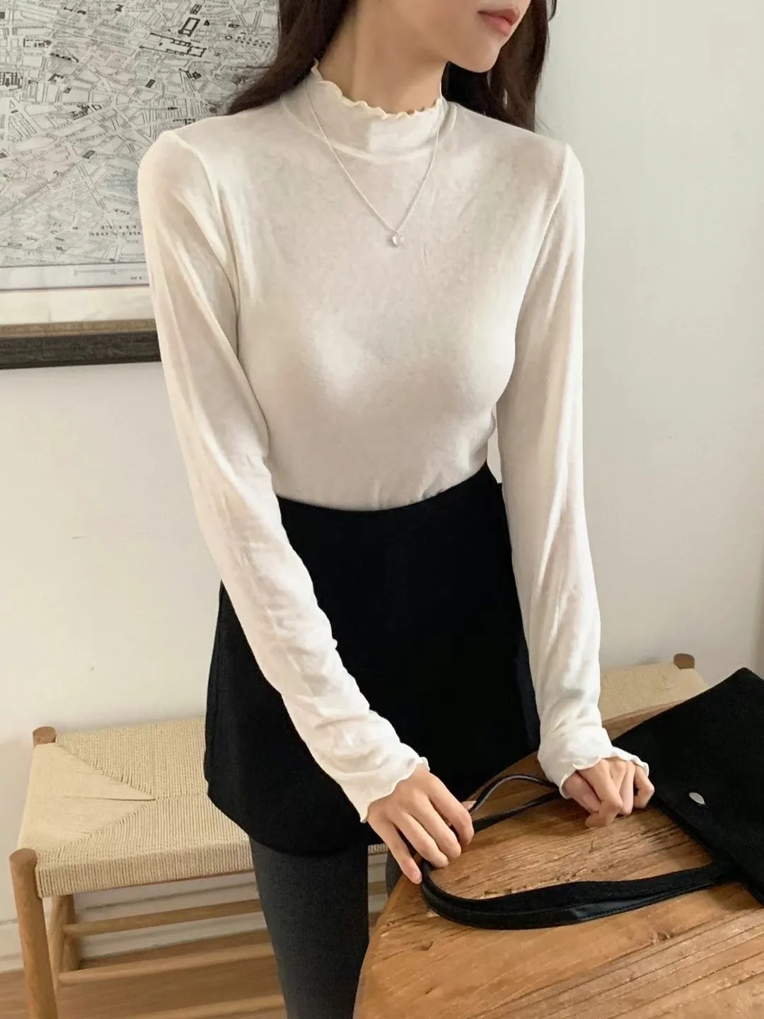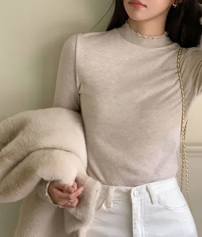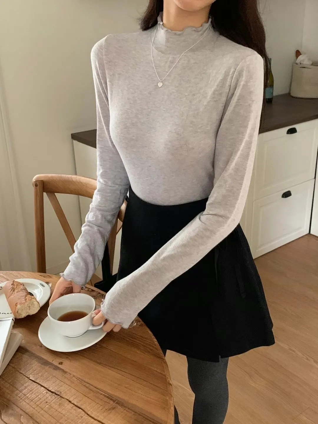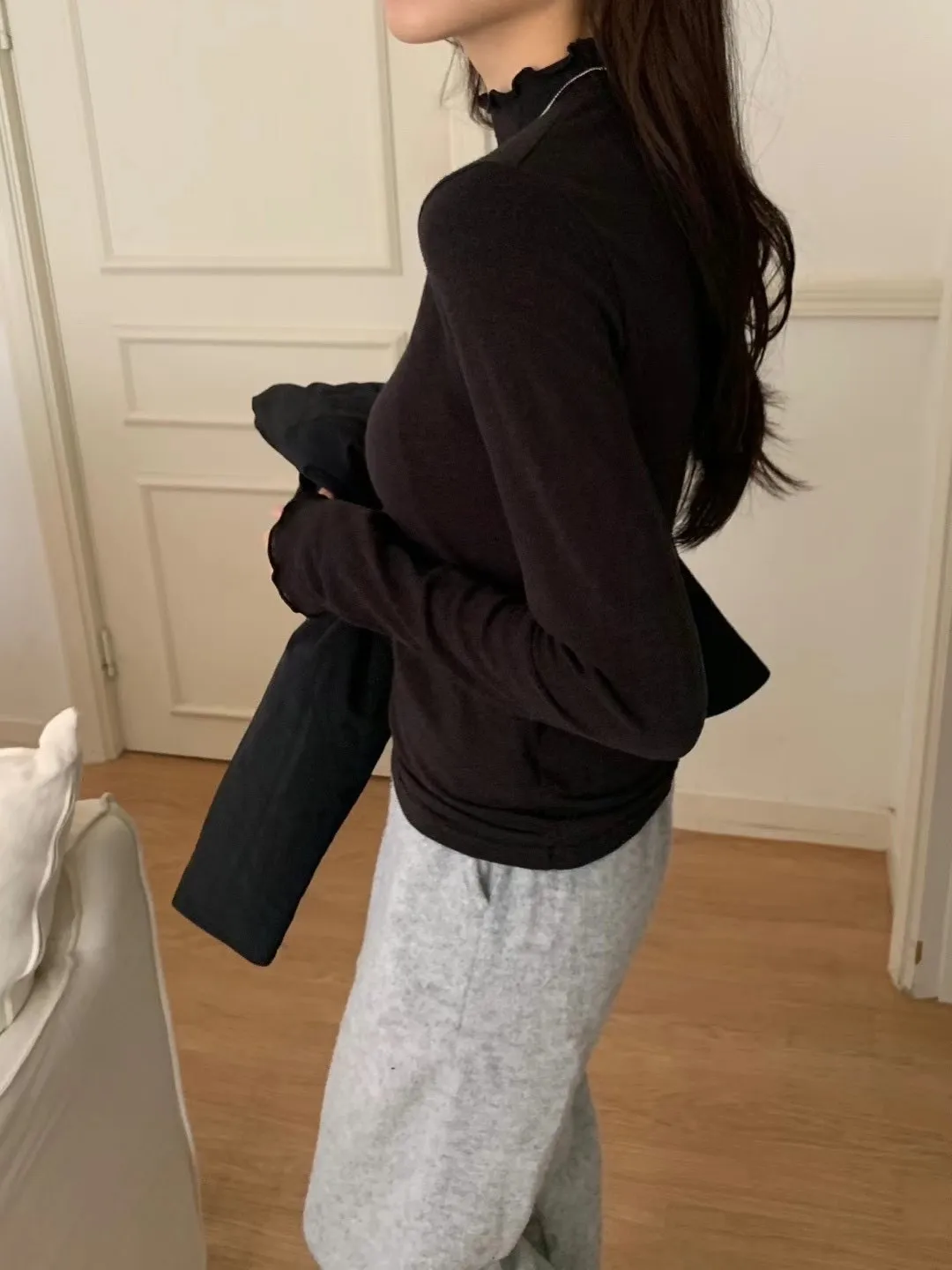 DCS4622 正韓 舒服彈性微高領卷邊打底衫F 米白 淺灰 杏色 黑色