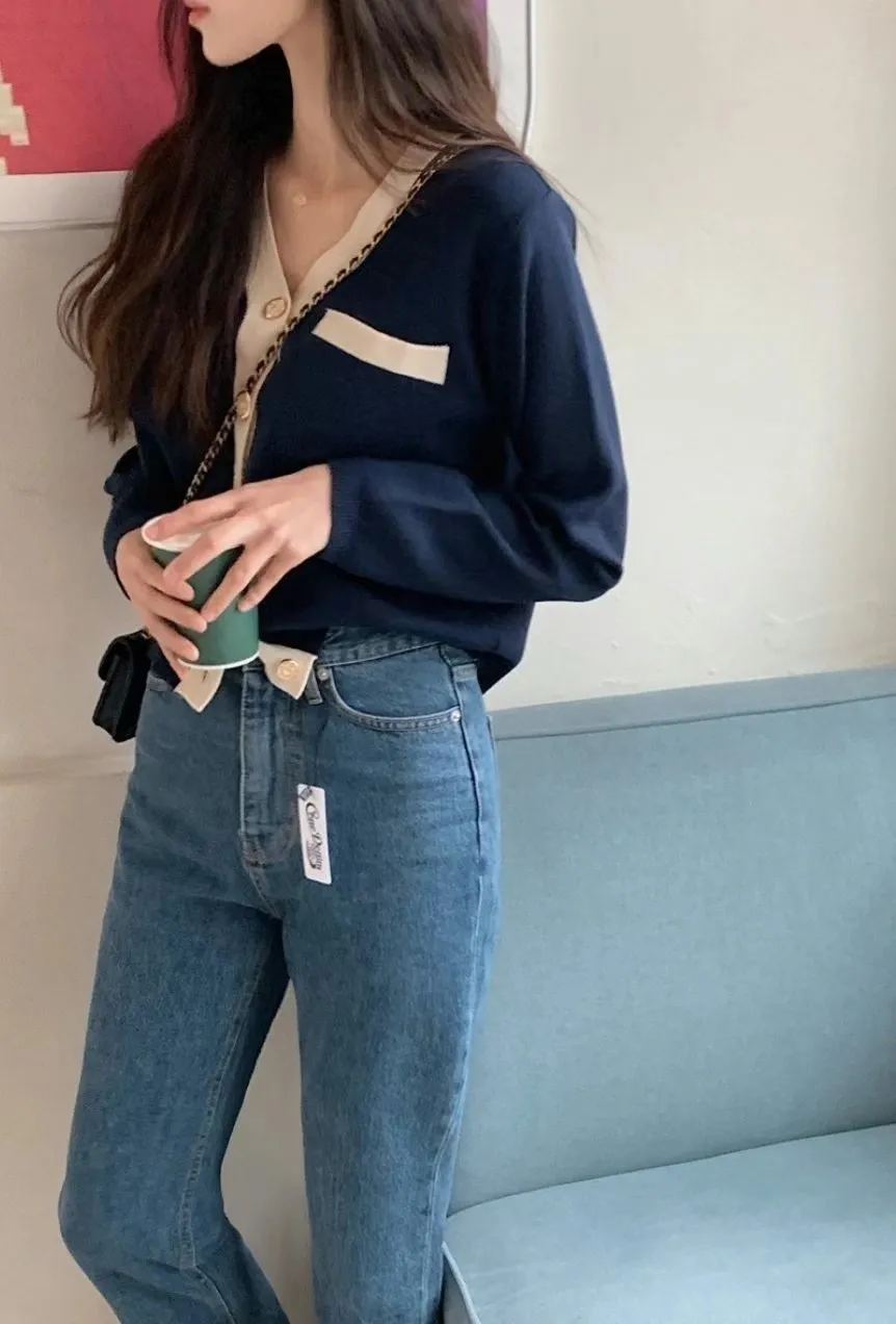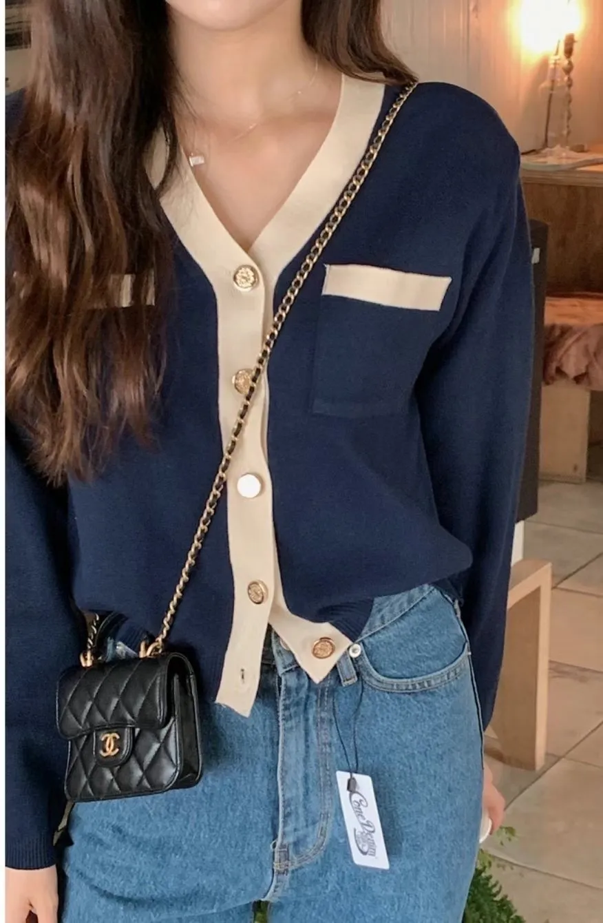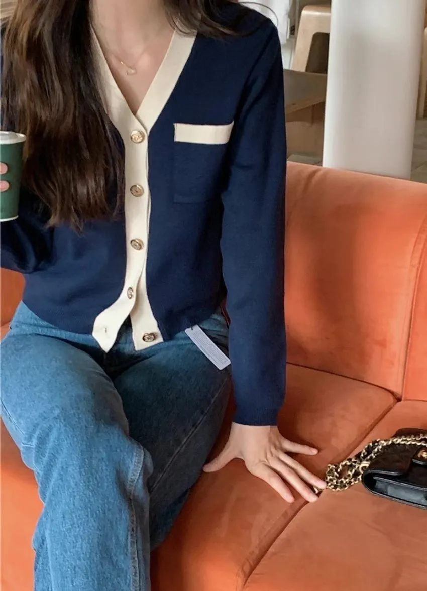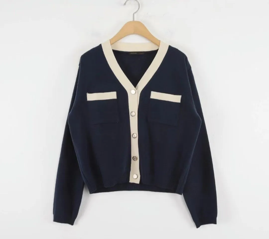 DCS4692 正韓 配色滾邊金扣針織外套F 深藍