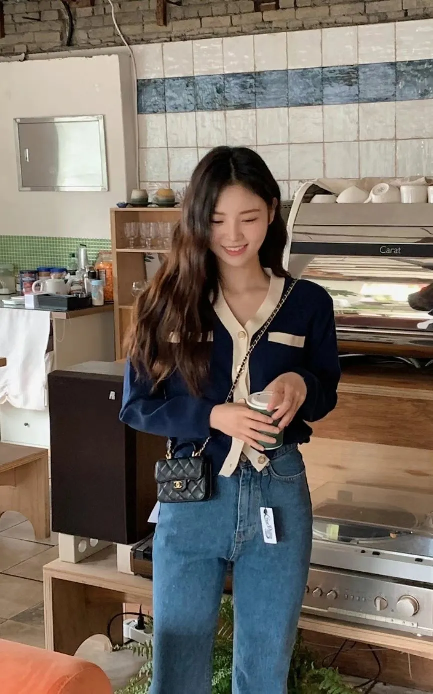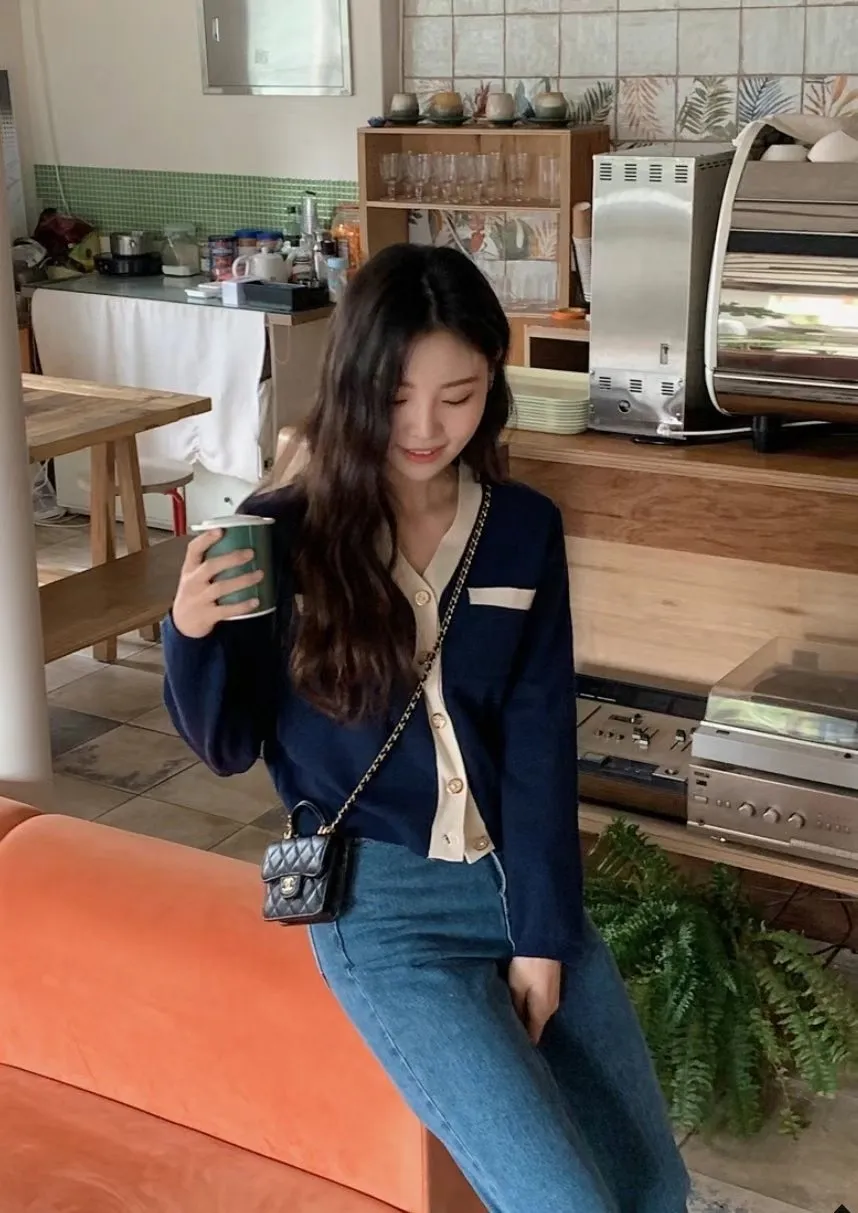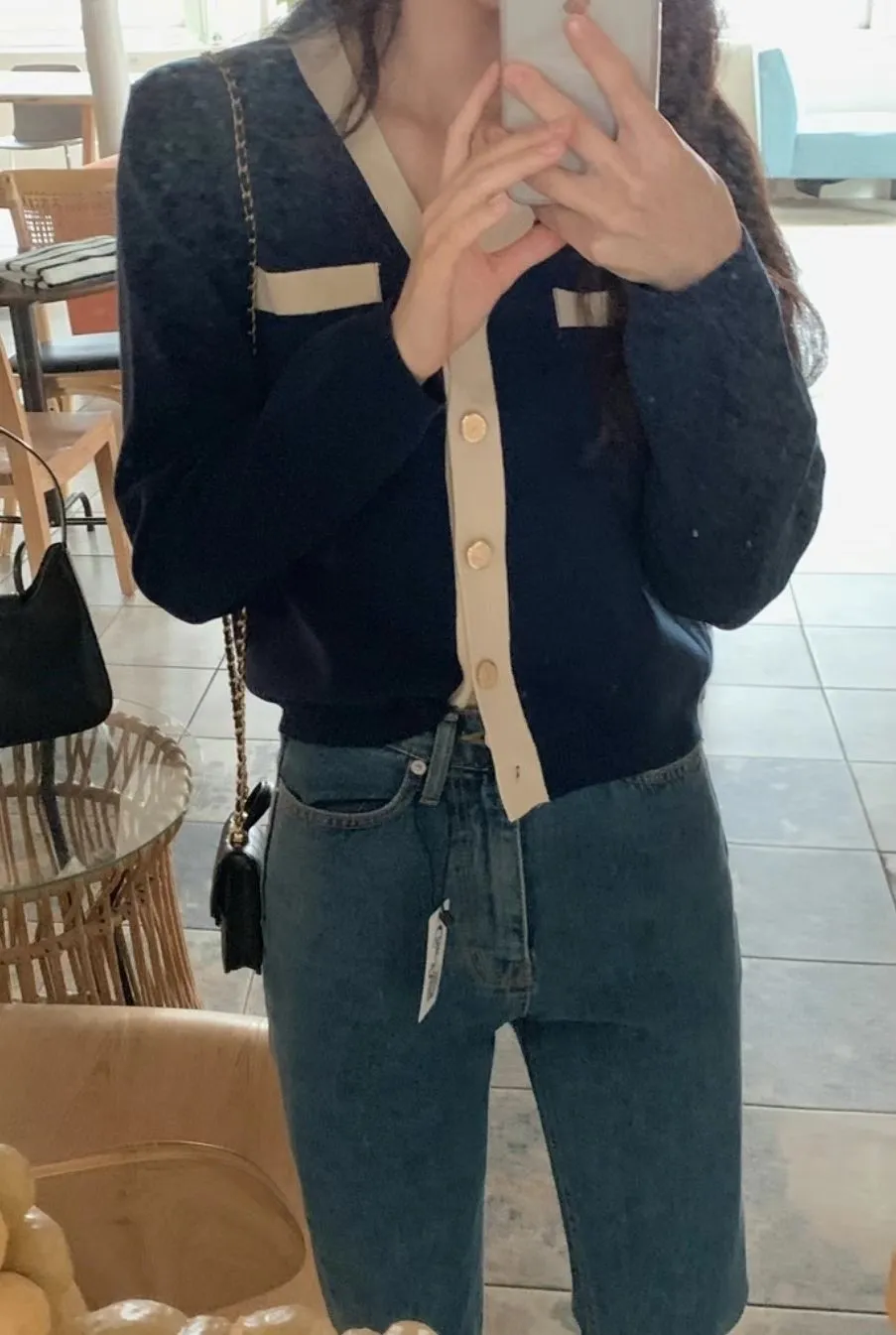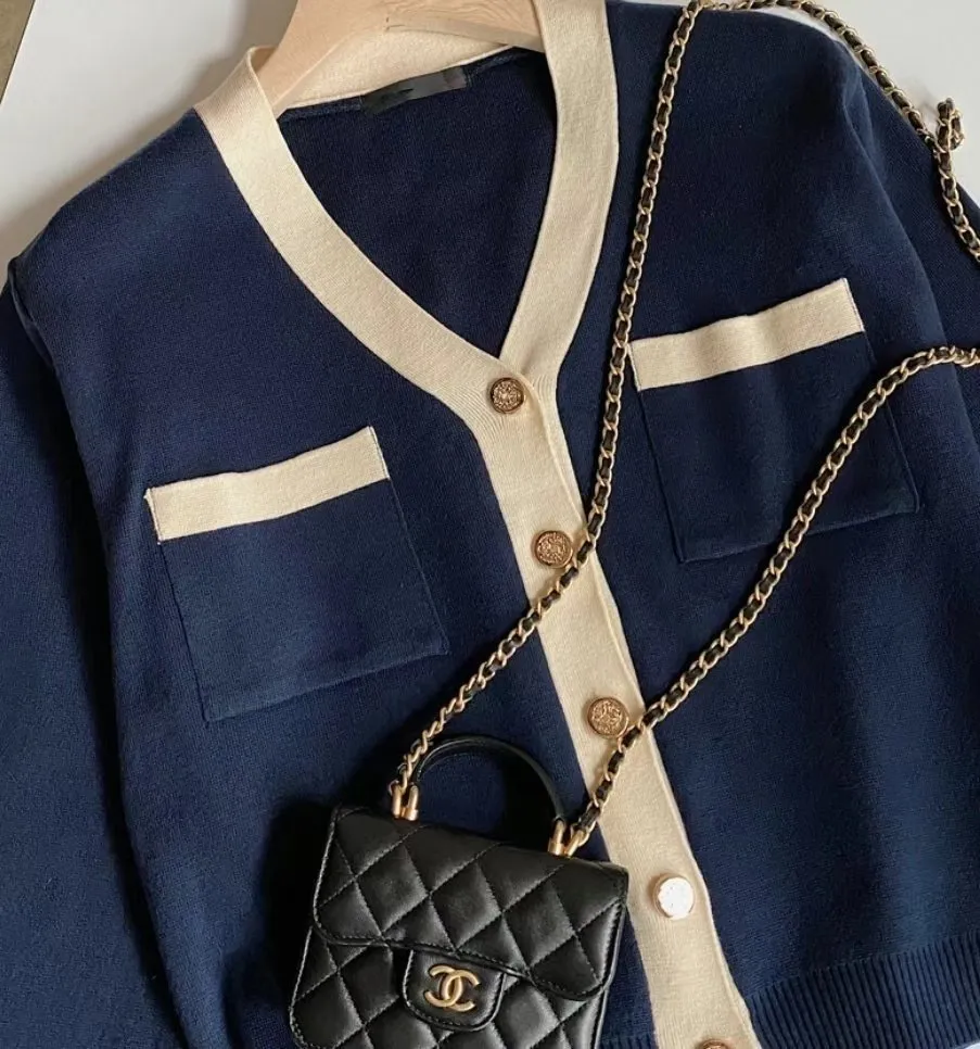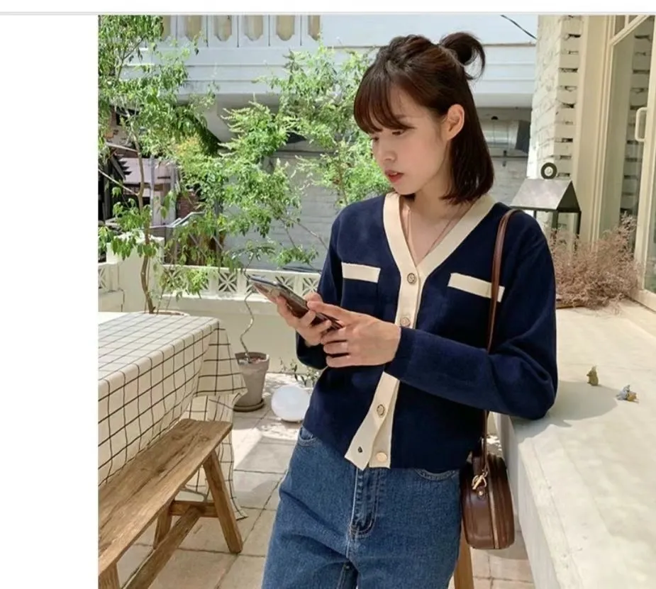 DCS4692 正韓 配色滾邊金扣針織外套F 深藍