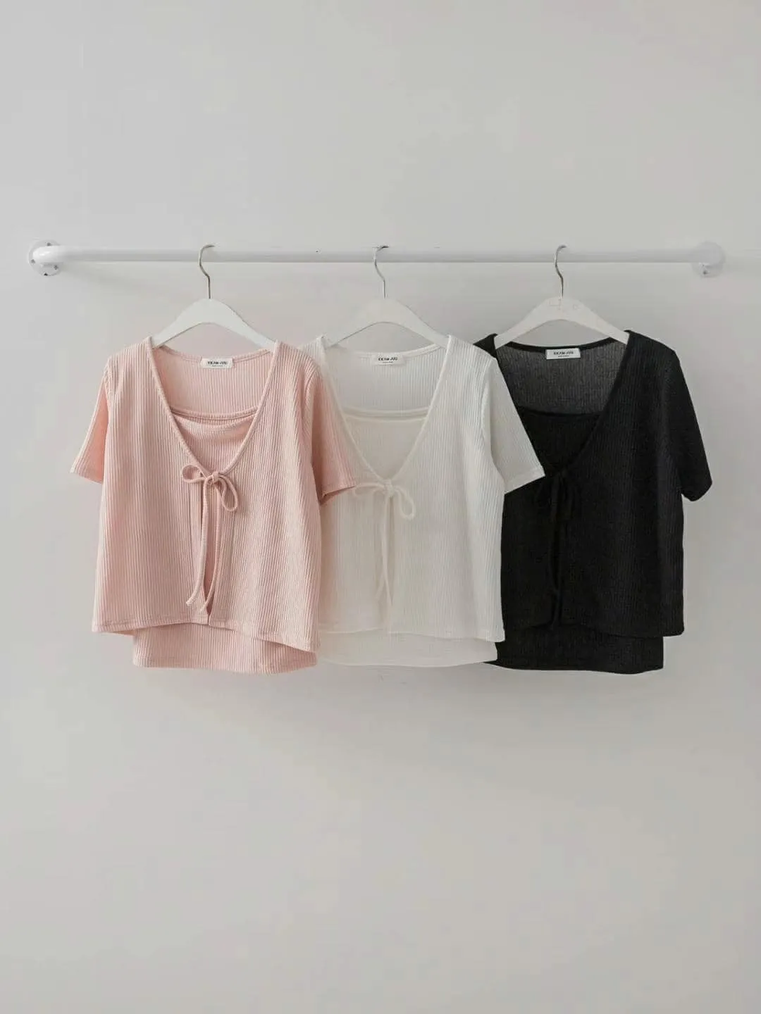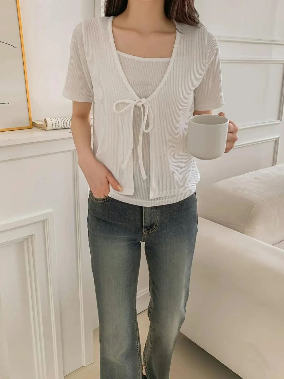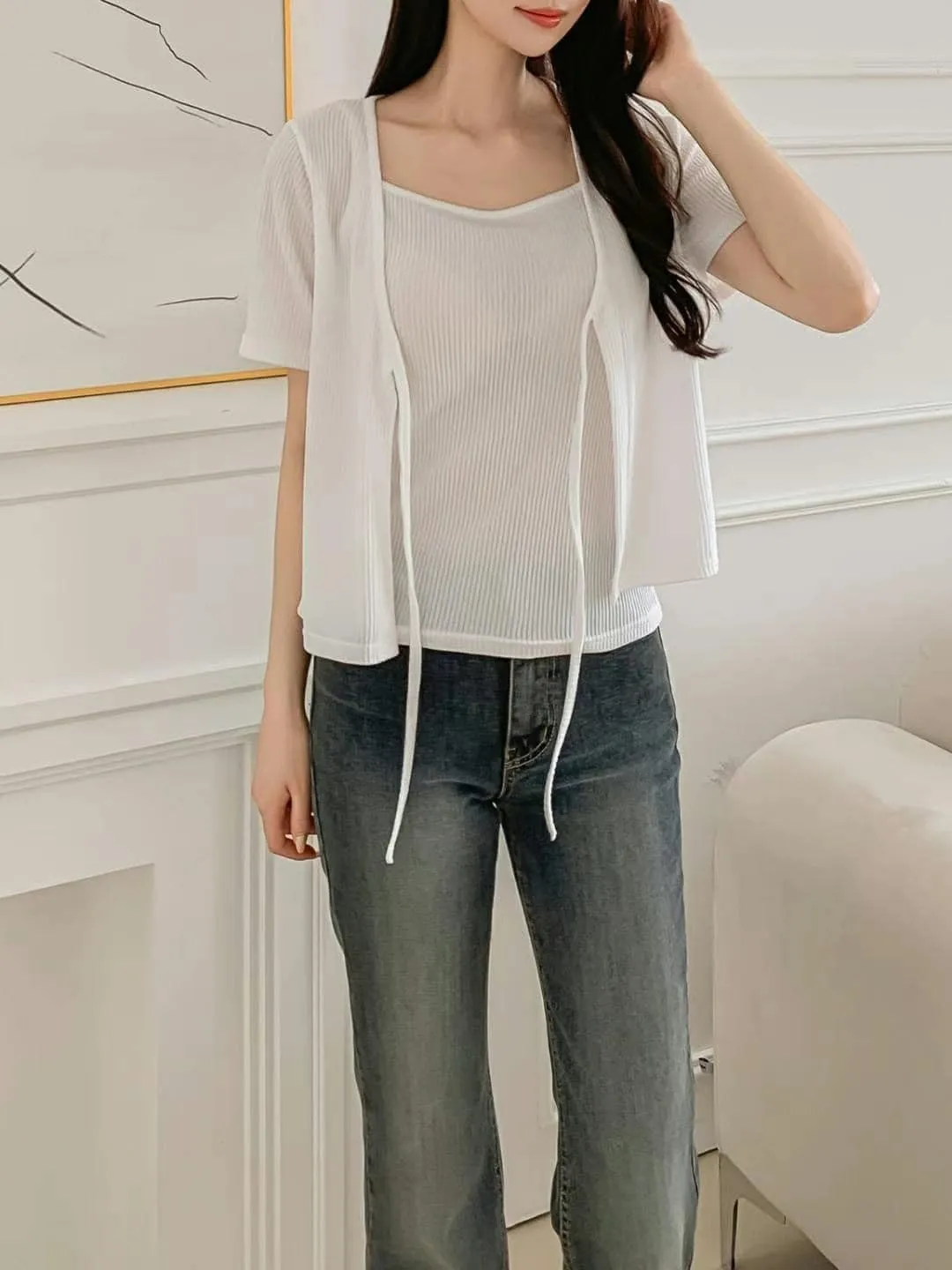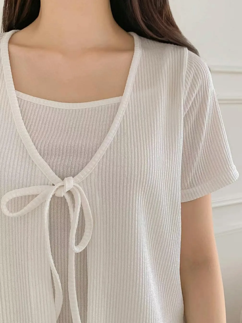 DCS5089 正韓 坑條針織綁帶外套+細肩set 粉色