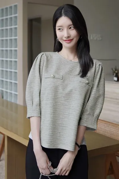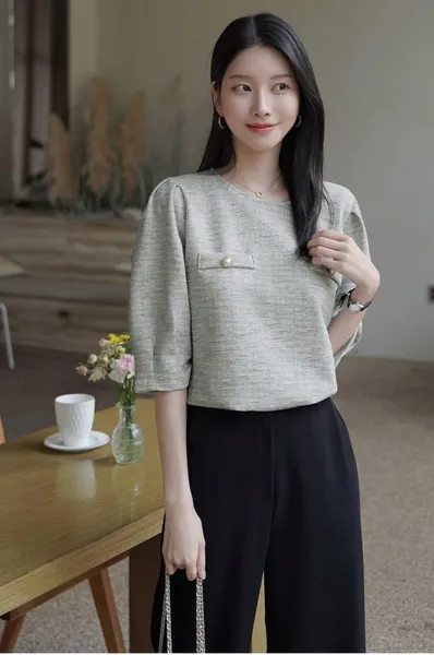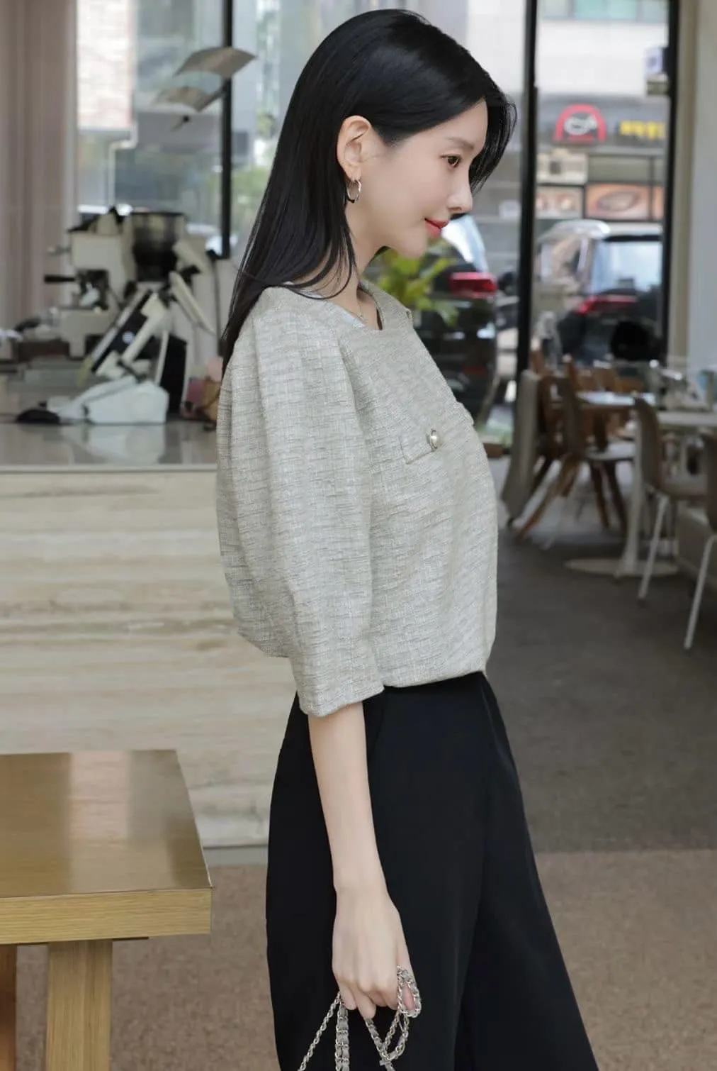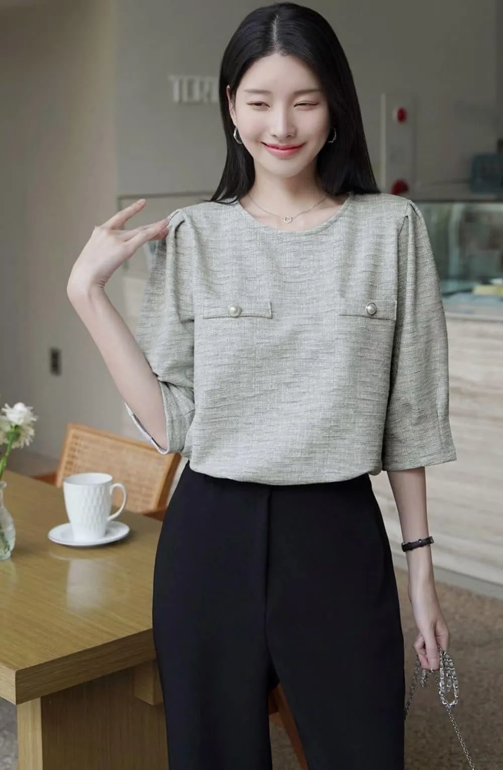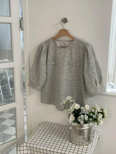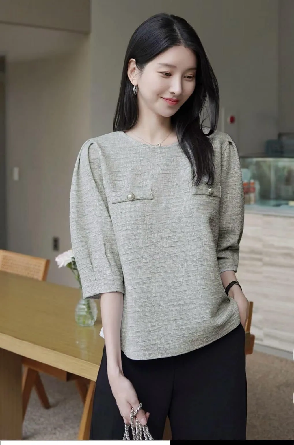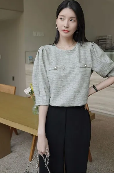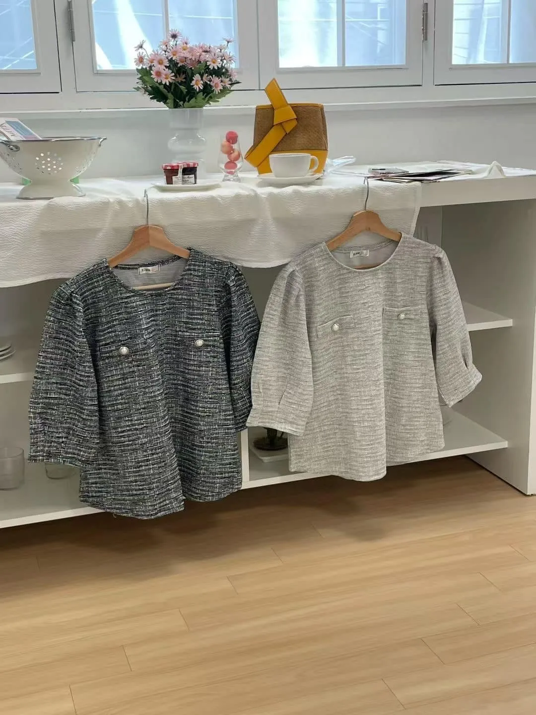 MA6451 小香風珍珠釦混色彈性棉衫F 單一色