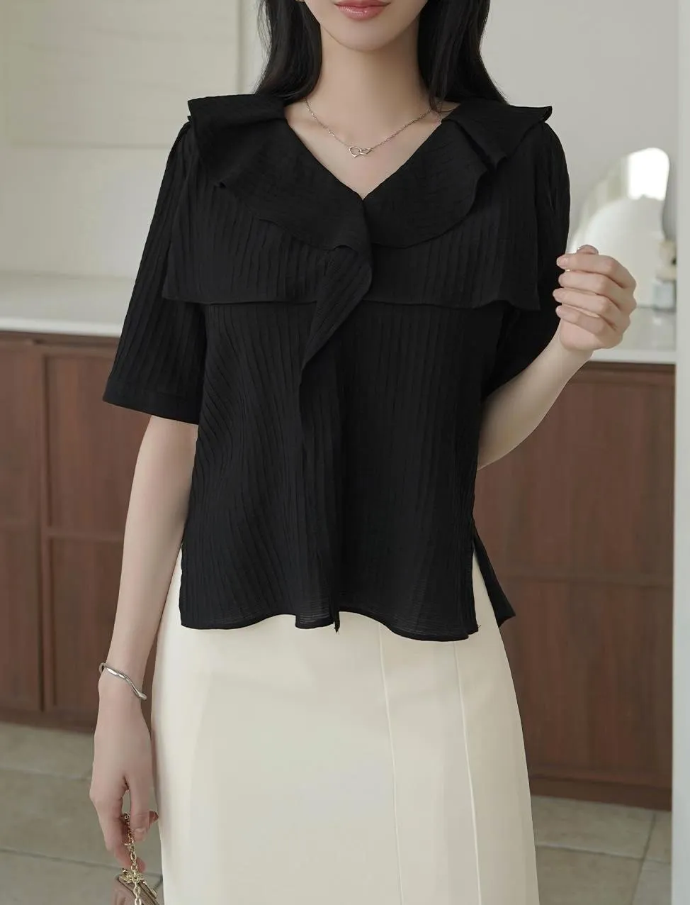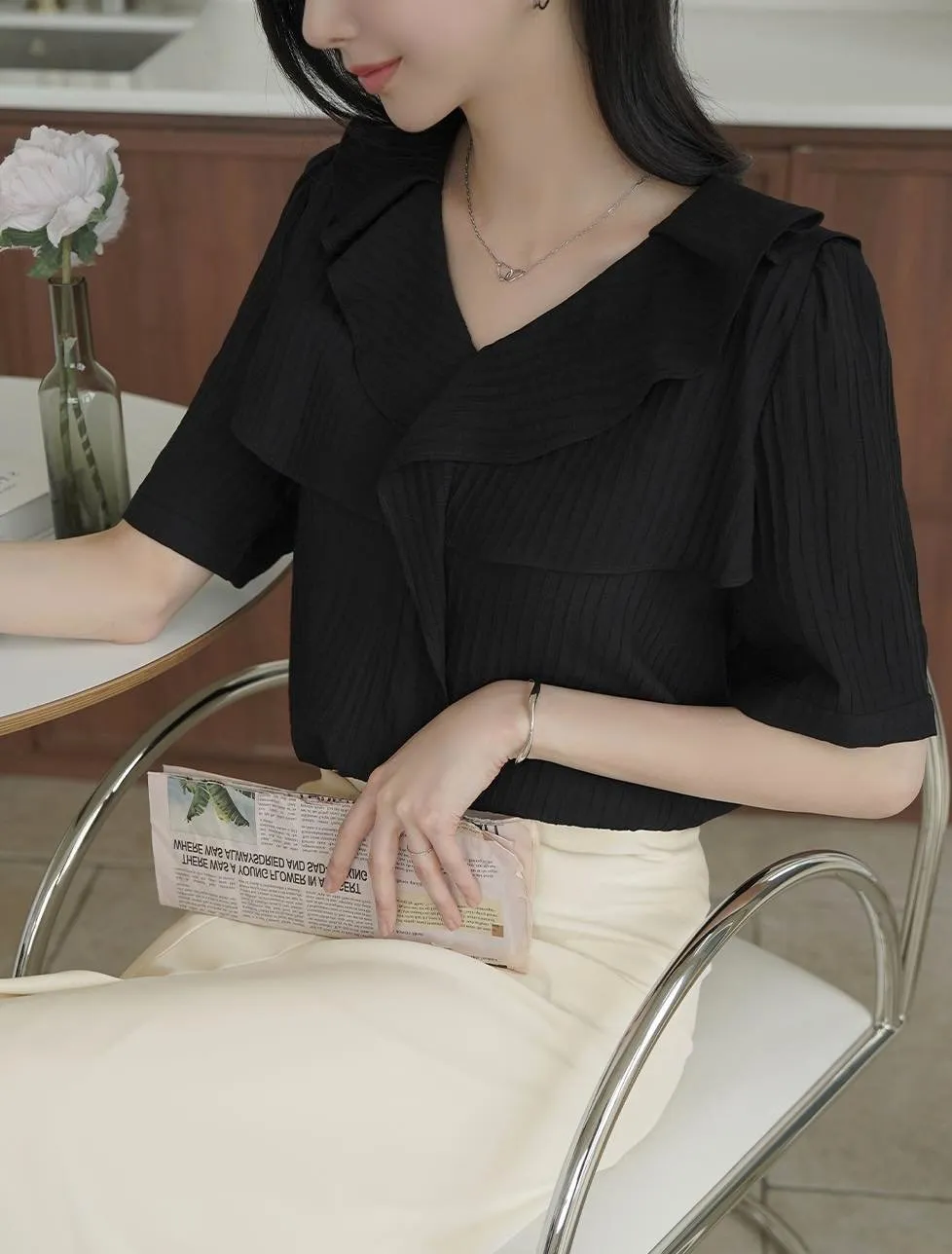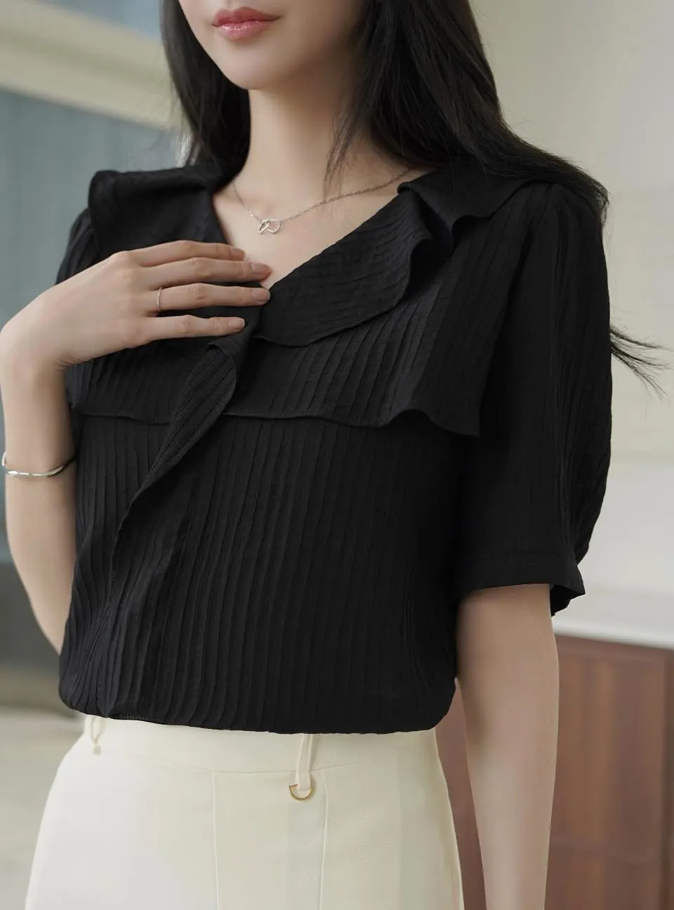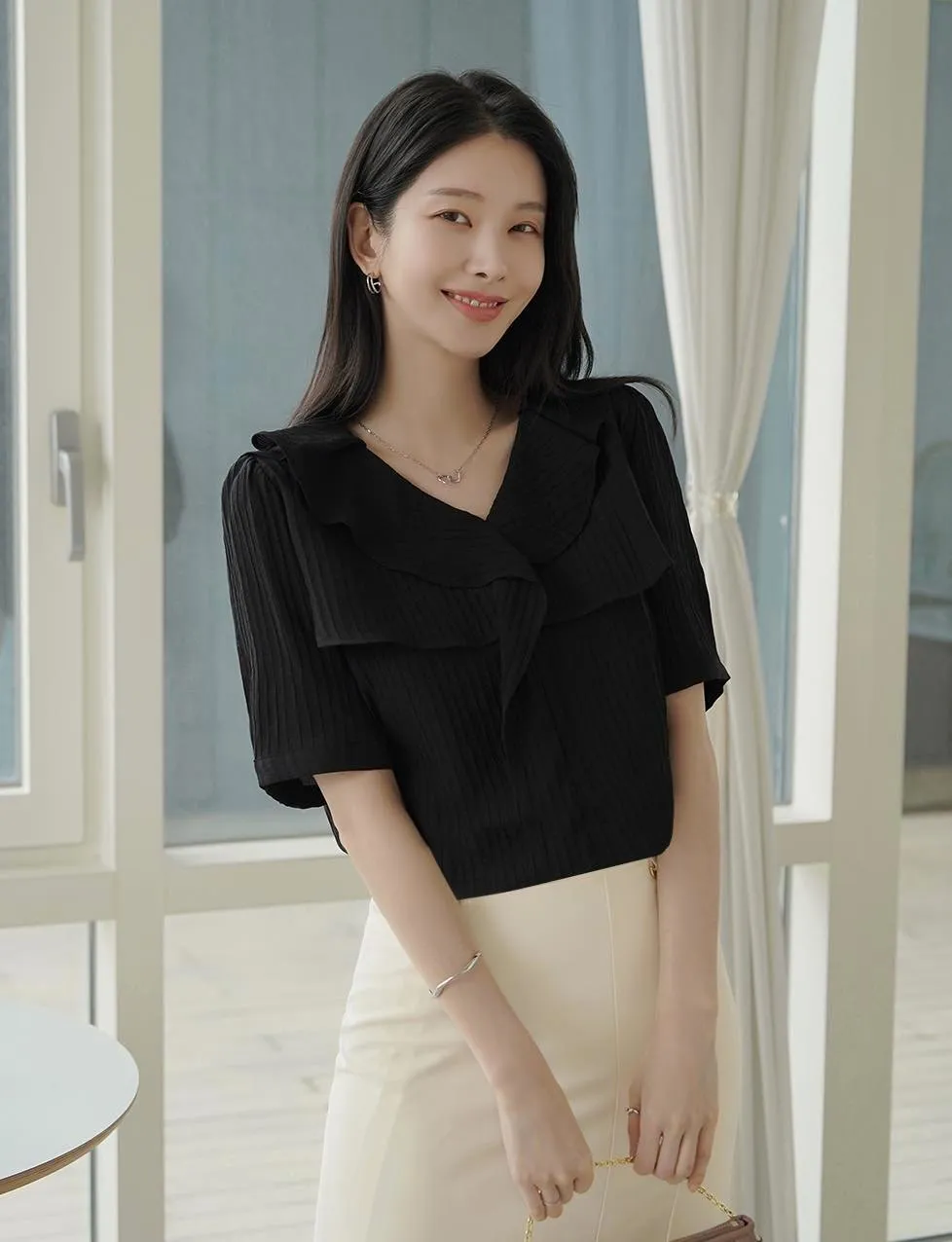 MY508 正韓 v領雙層荷葉質感上衣F 黑色現貨