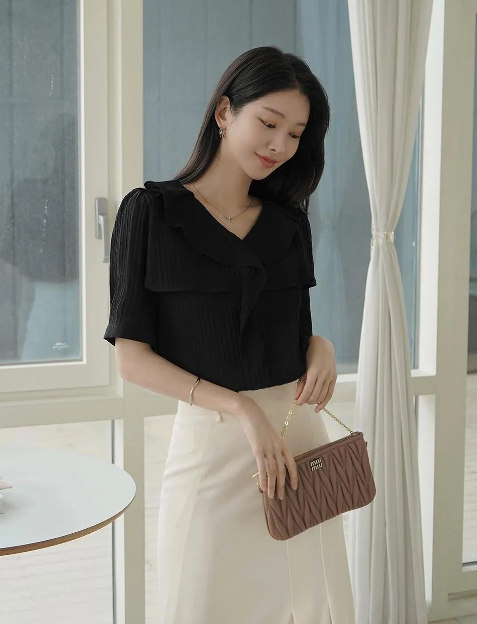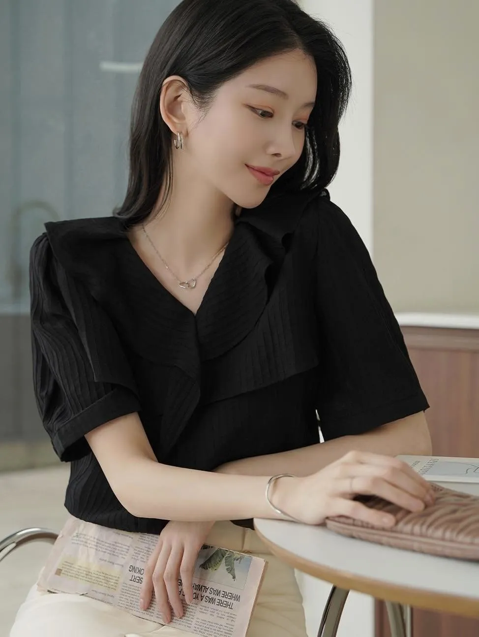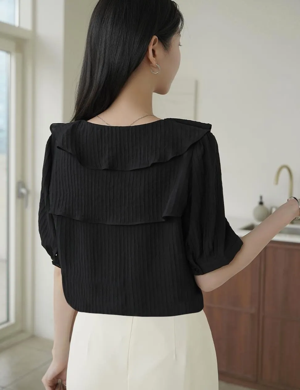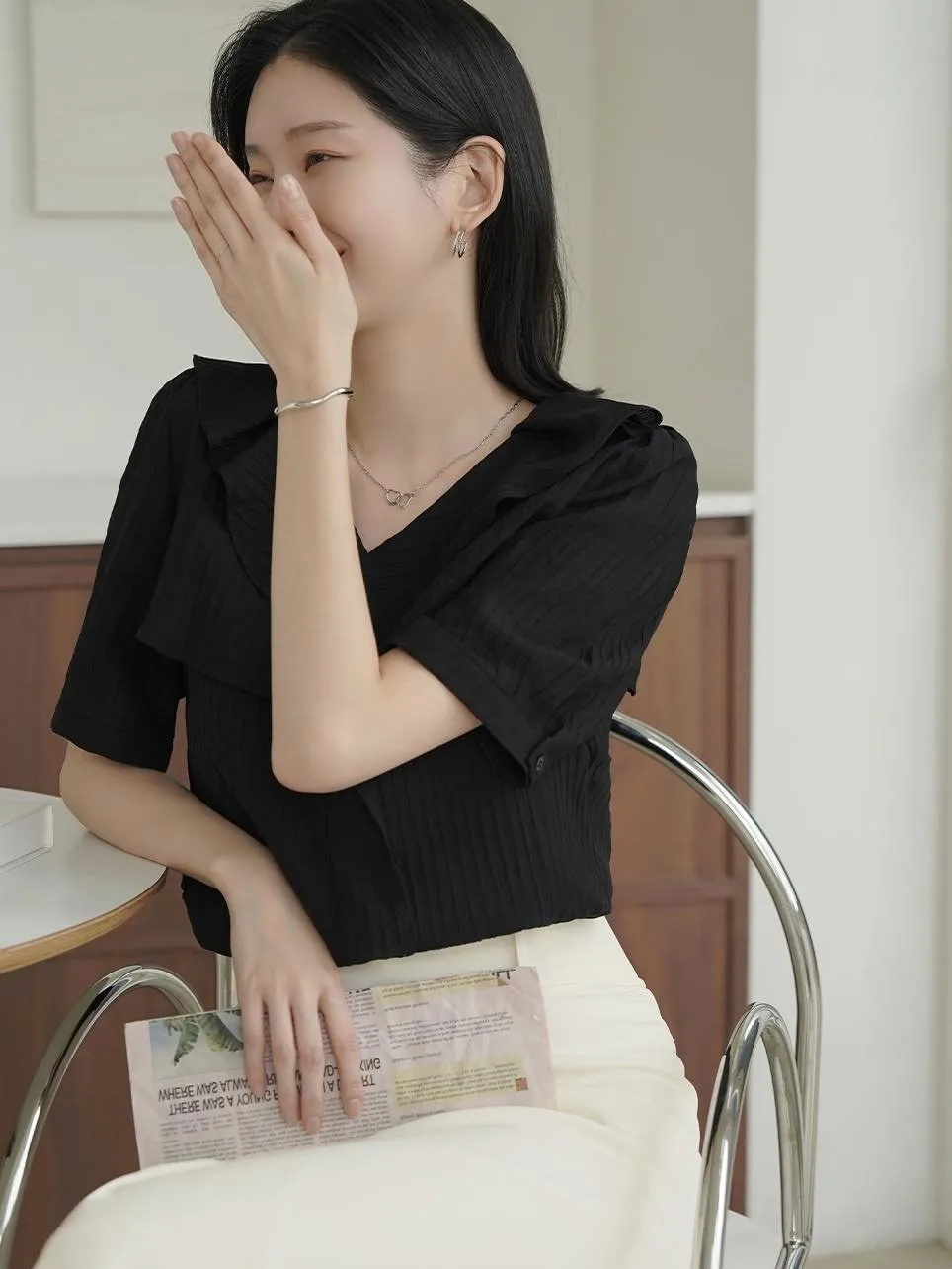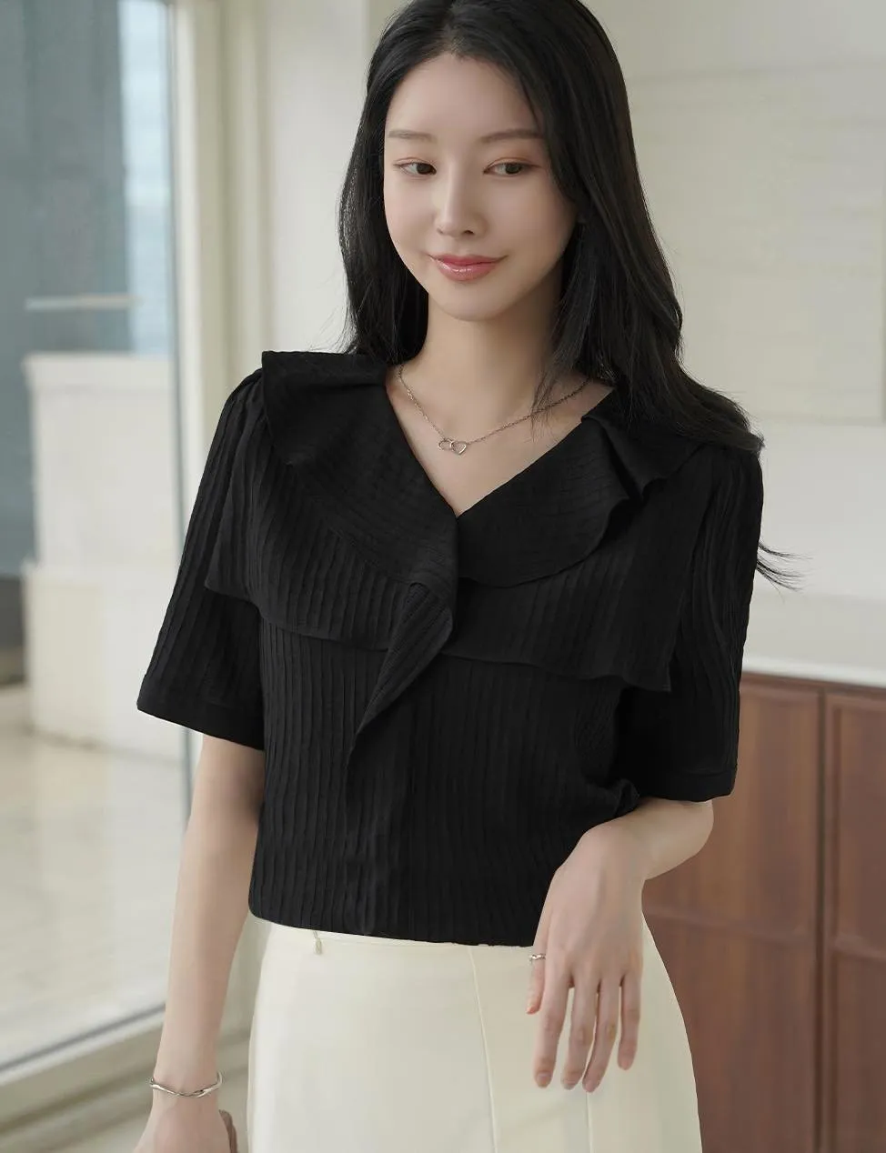 MY508 正韓 v領雙層荷葉質感上衣F 黑色現貨