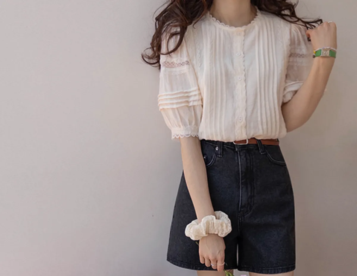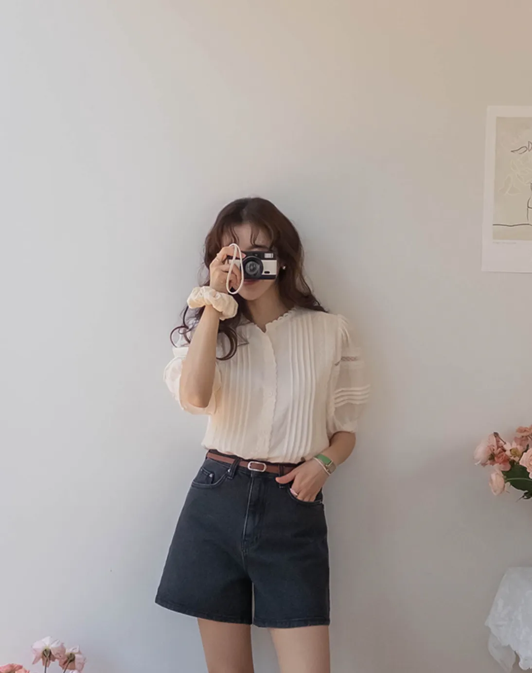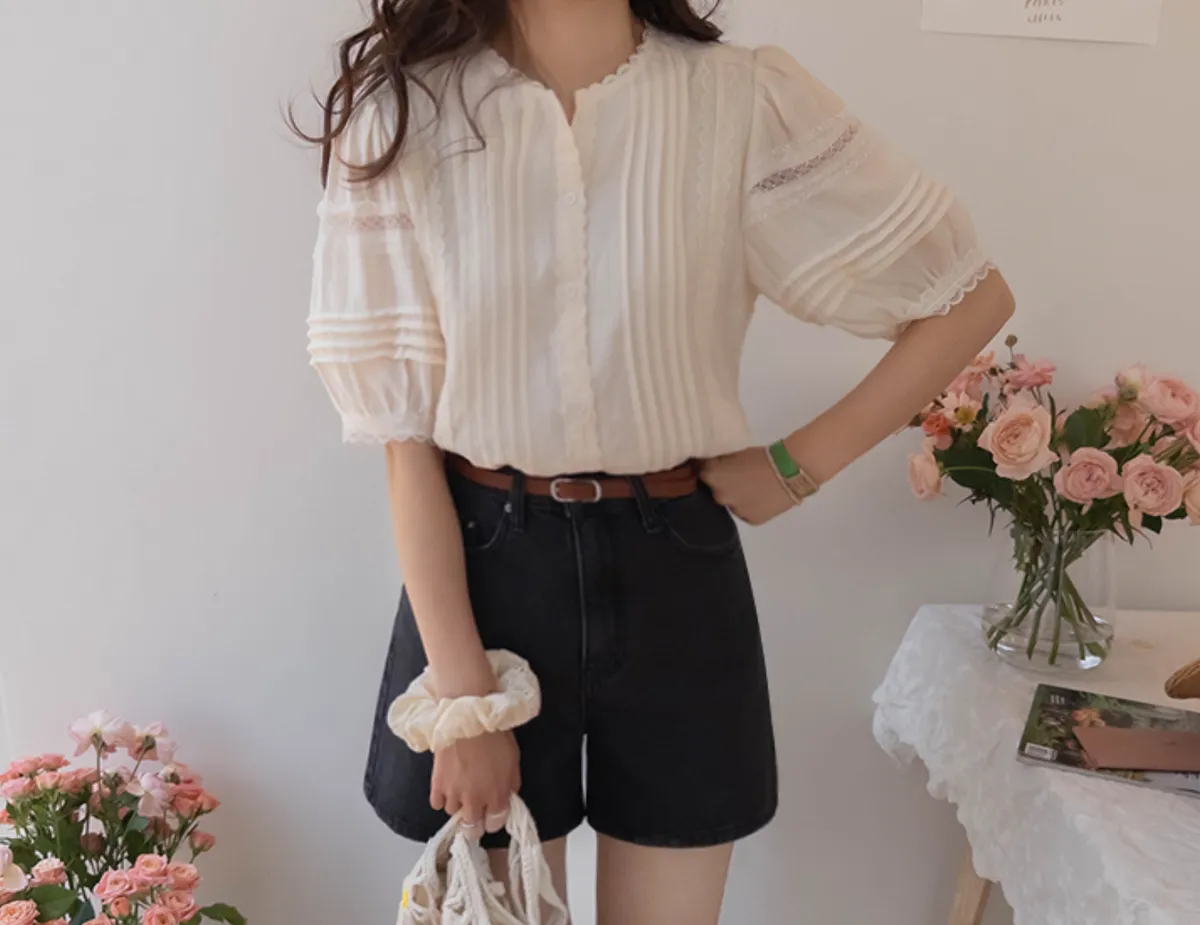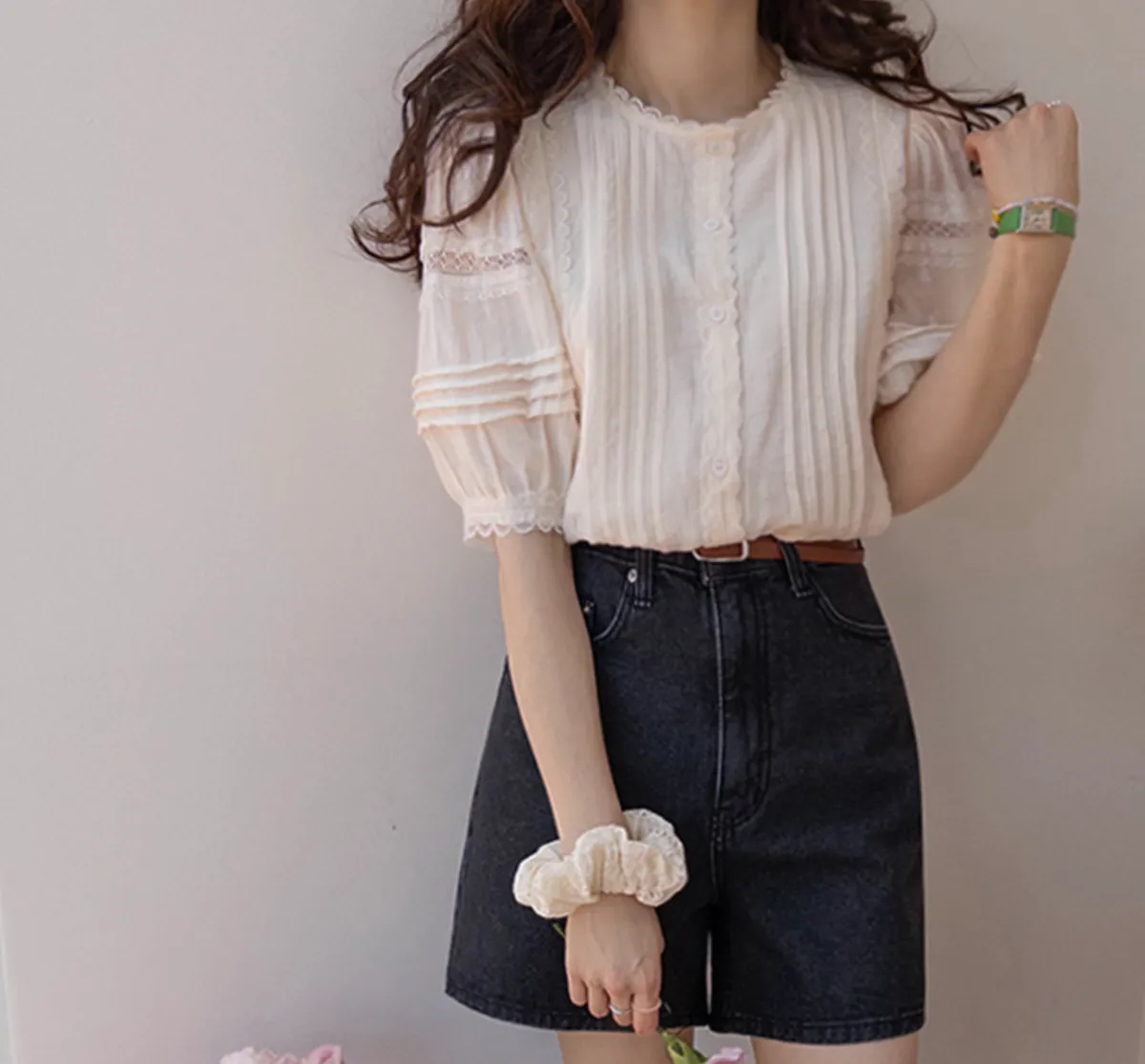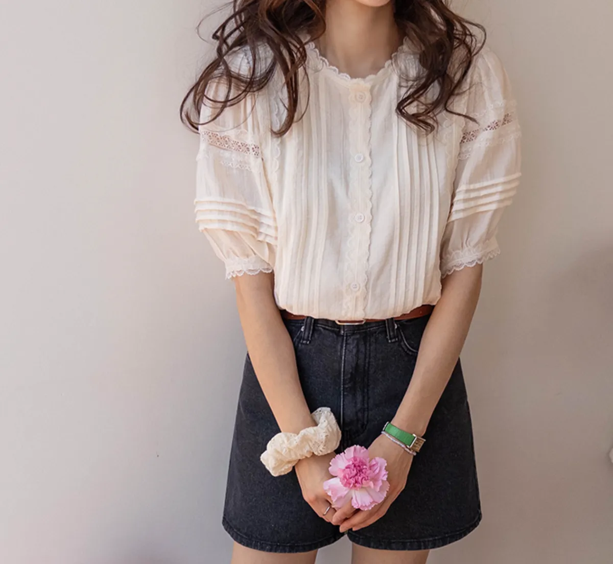 MY525 正韓 法式蕾絲壓折排扣襯衫F 最後現貨