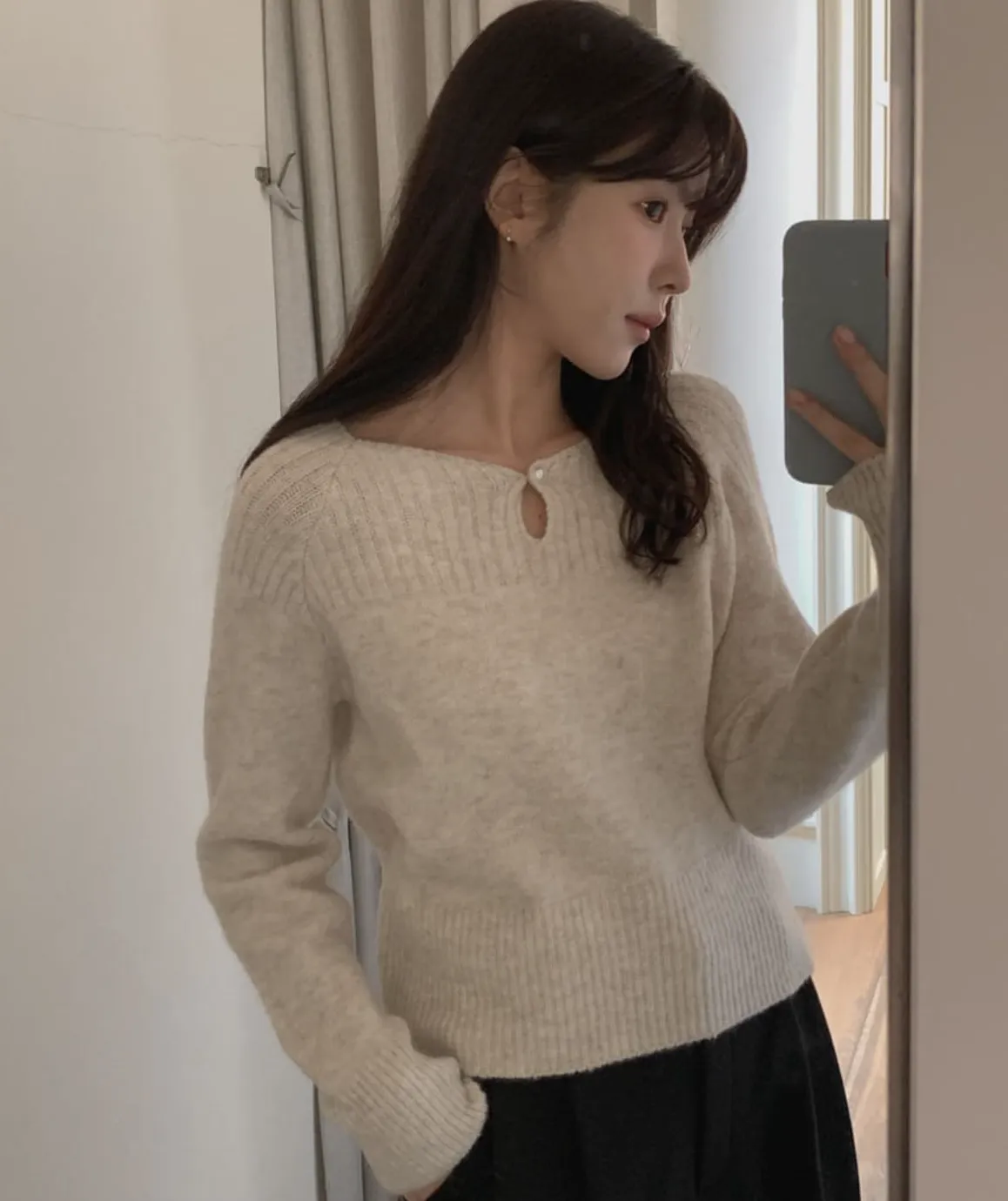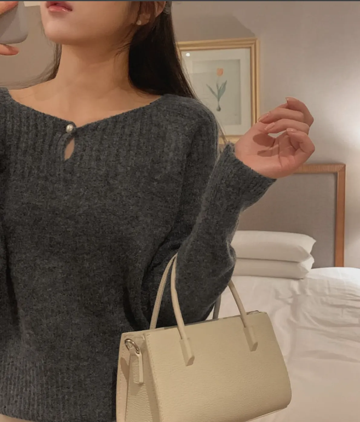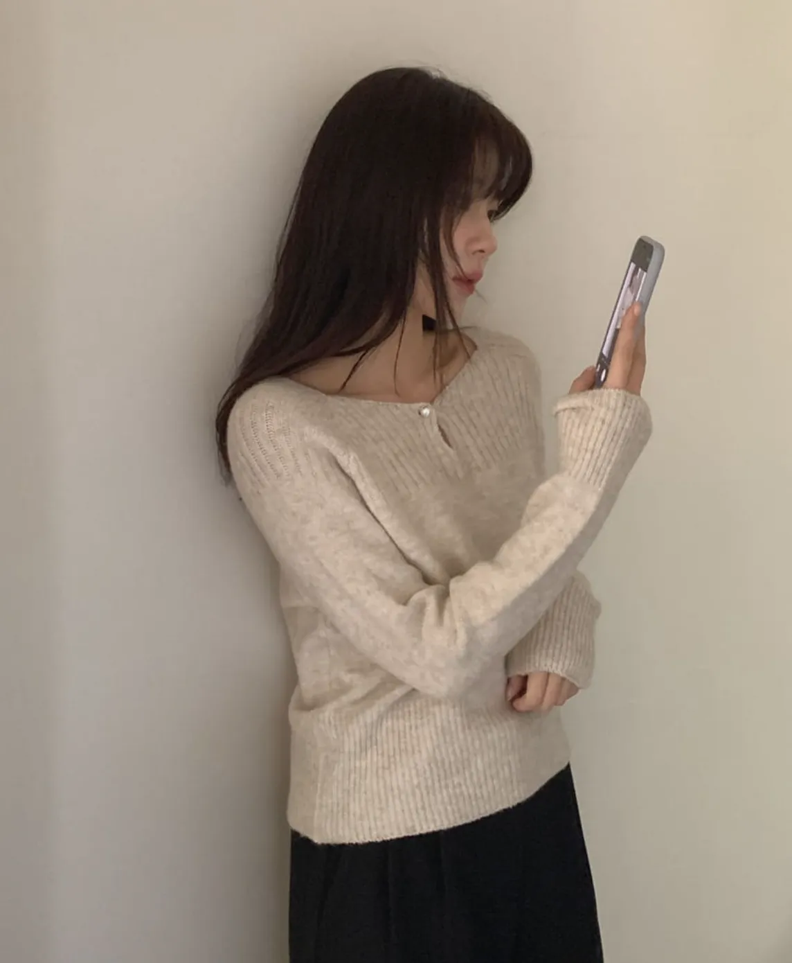 NV430 甜美船型領珍珠釦針織衫F 燕麥色