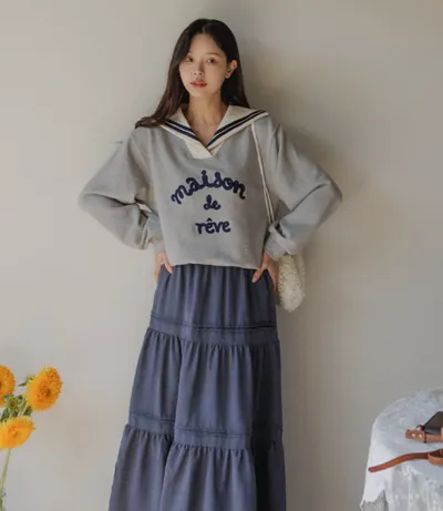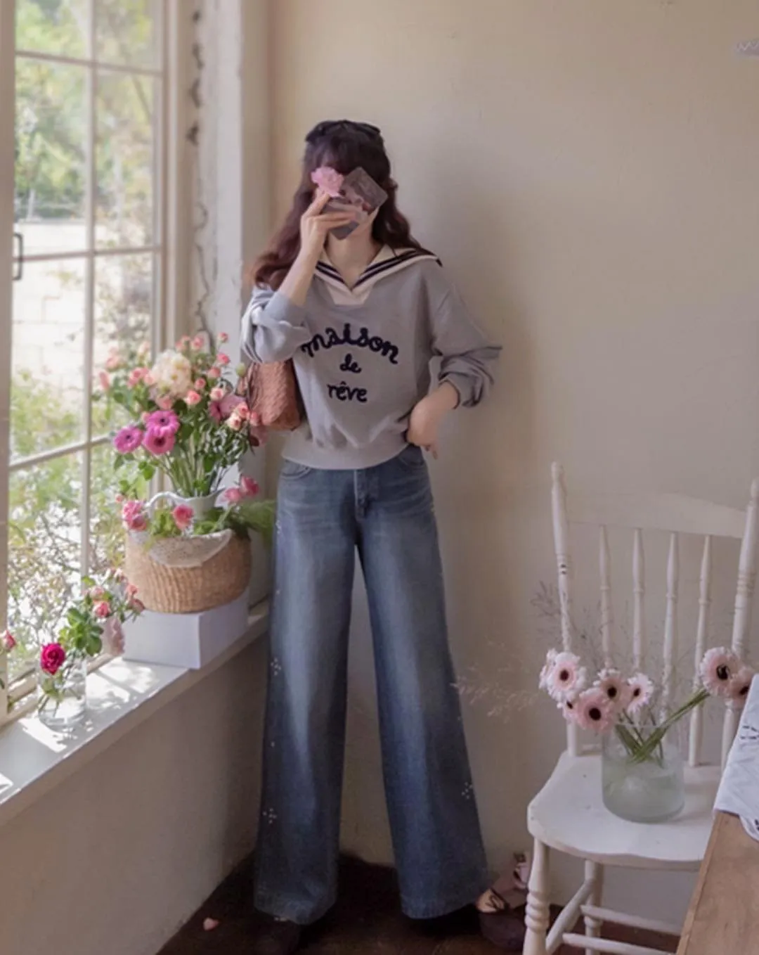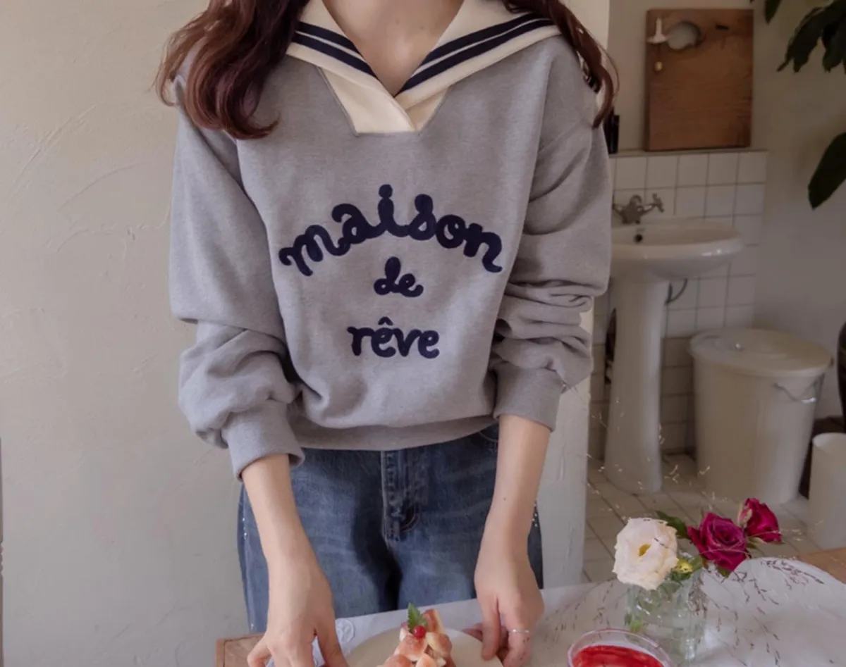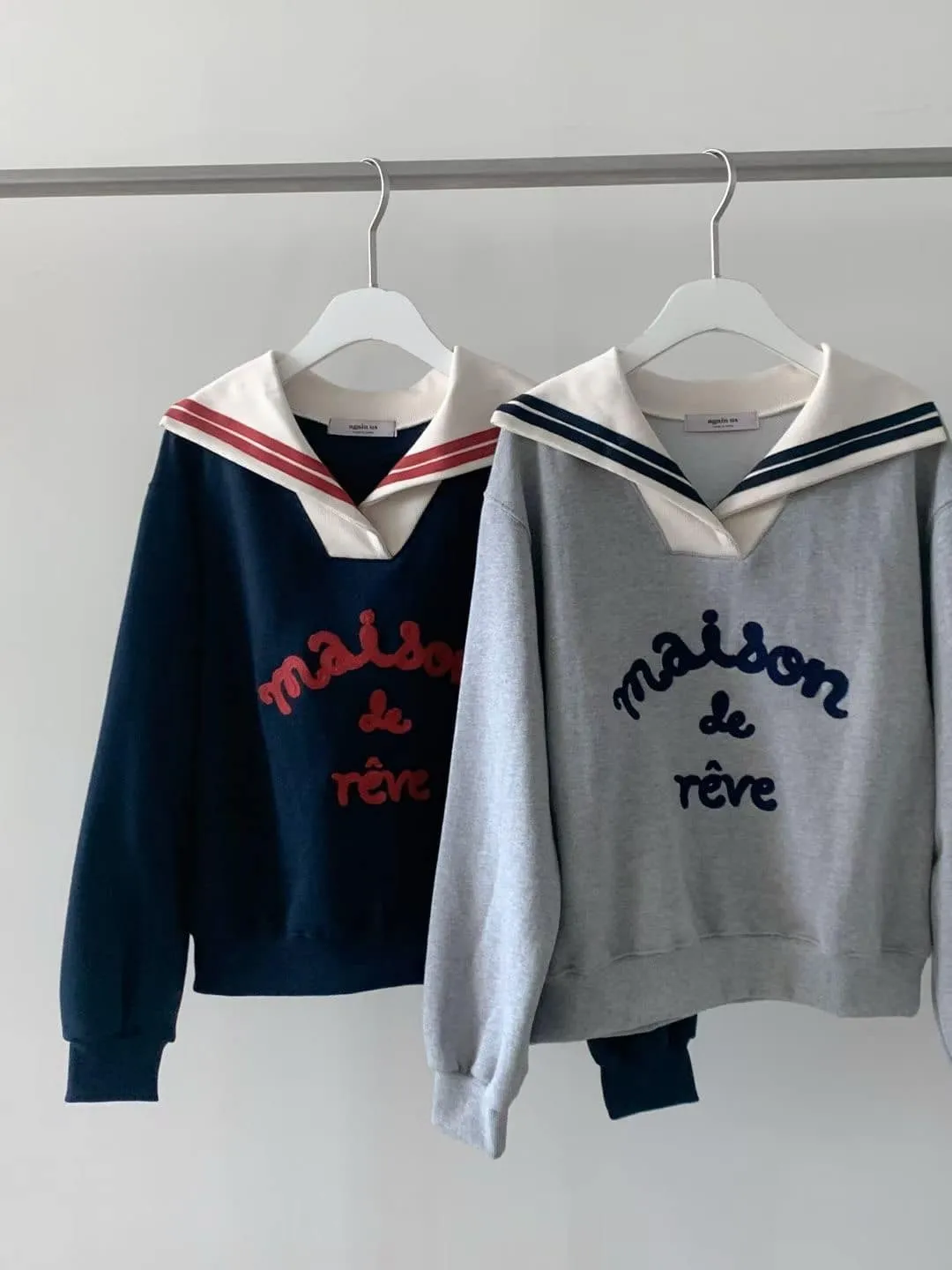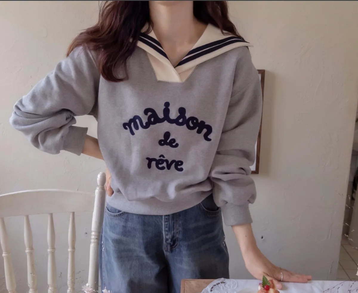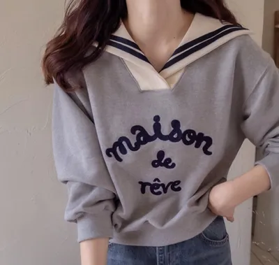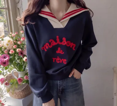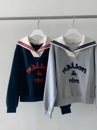 非常有特色的水手領設計 真的很好看,穿起來很有氣場 也是韓國超級熱賣的一款衛衣 高質感的棉質布料 穿起來很舒服 字母是刺繡的,可可愛愛 正常衛衣厚度 Made in Korea 肩寬50胸寬52全長59cm