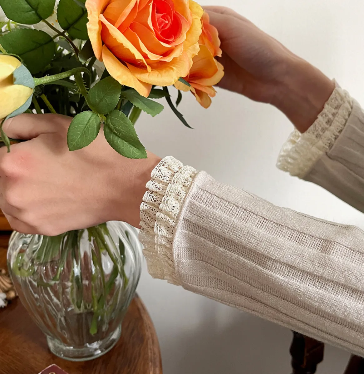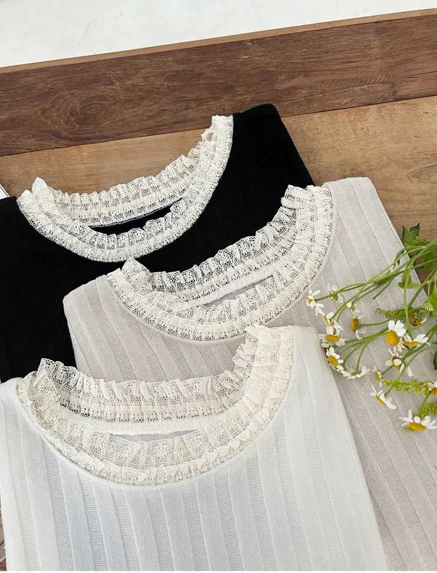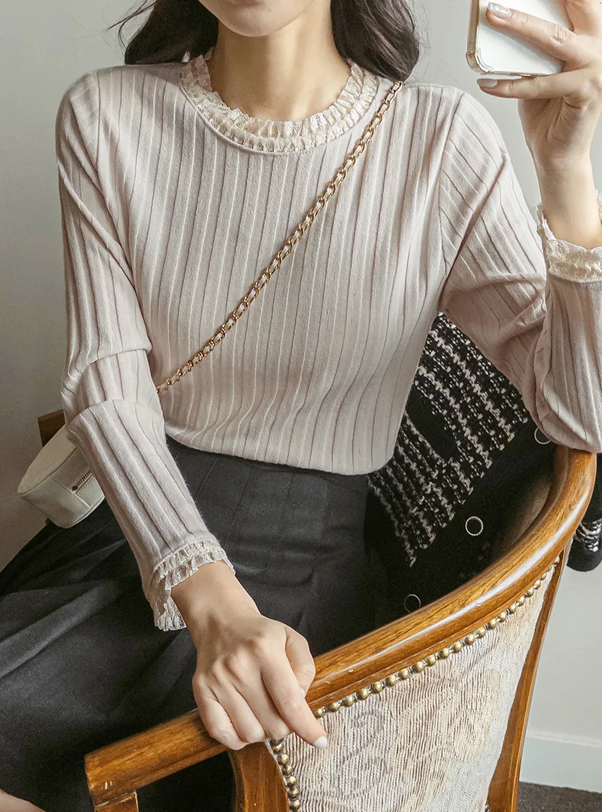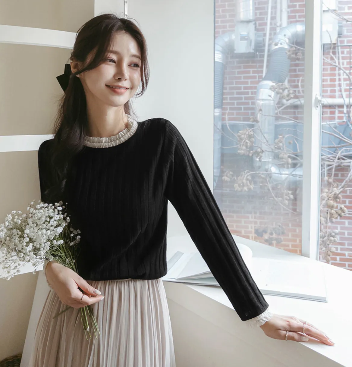 OC303 正韓 綴蕾絲坑條針織衫F 黑色 淺米現貨