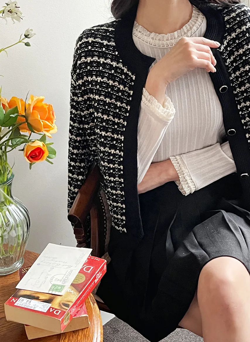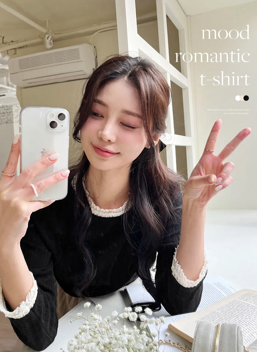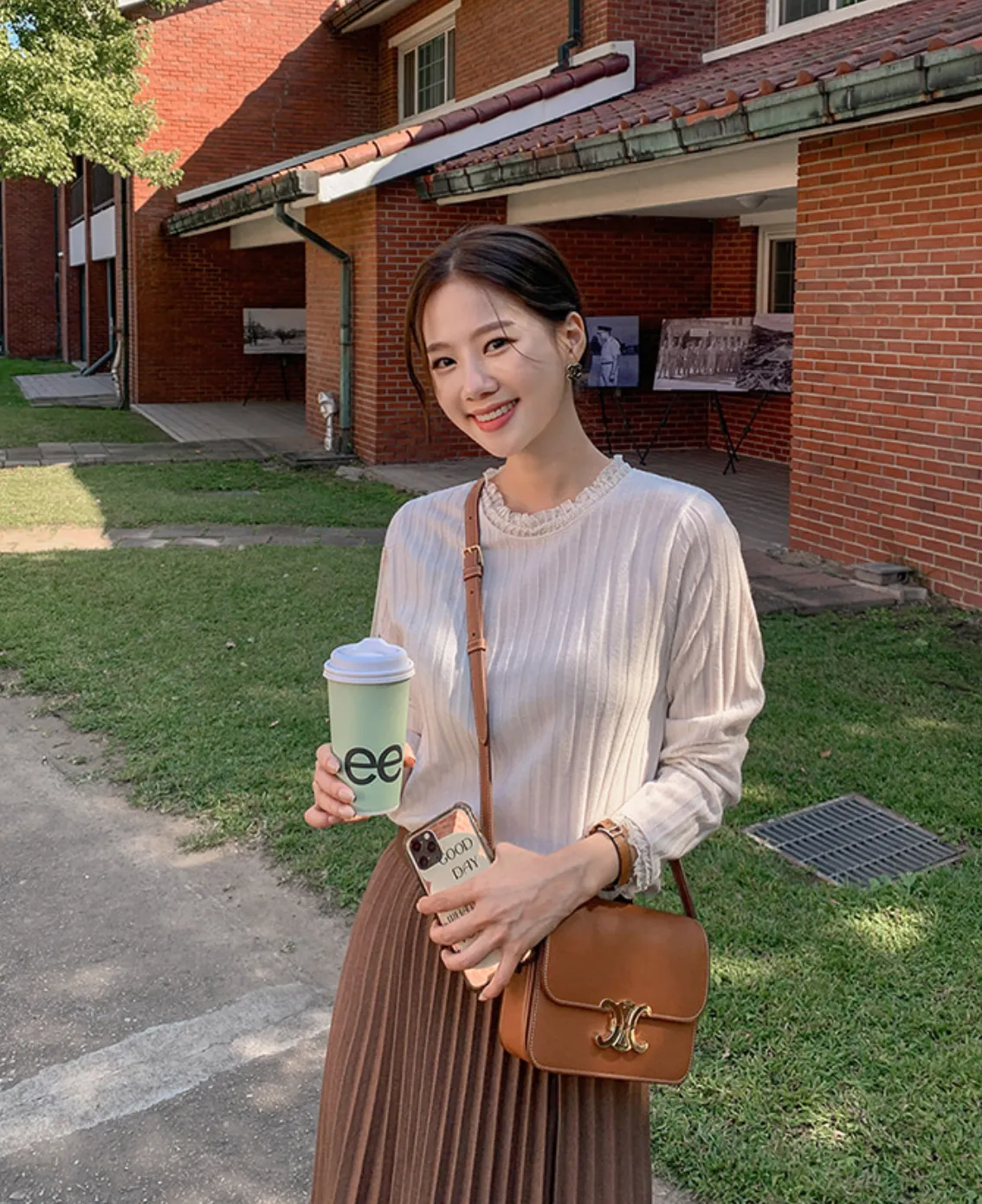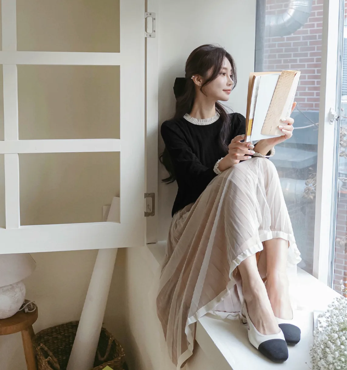 OC303 正韓 綴蕾絲坑條針織衫F 黑色 淺米現貨
