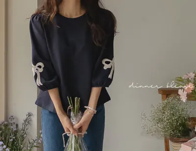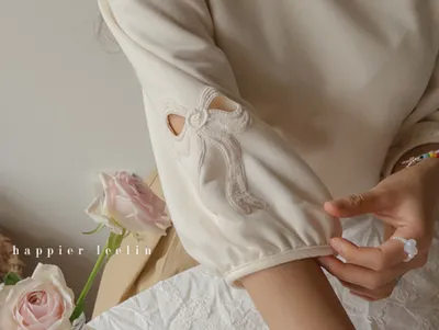 OC413 蝴蝶結簍空刺繡七分袖棉衫F 米色 黑色 白色