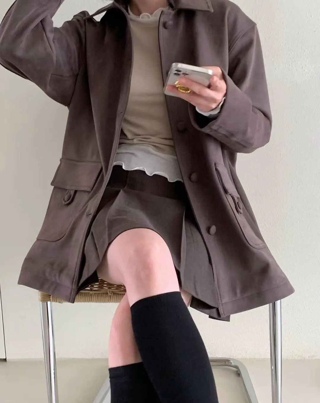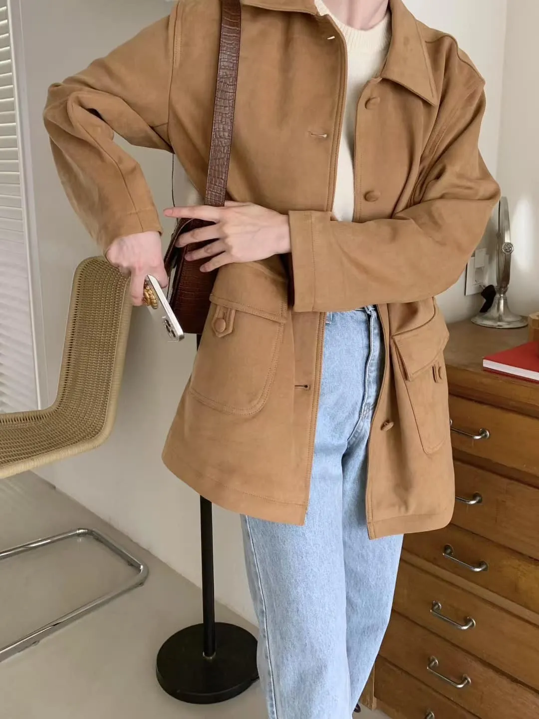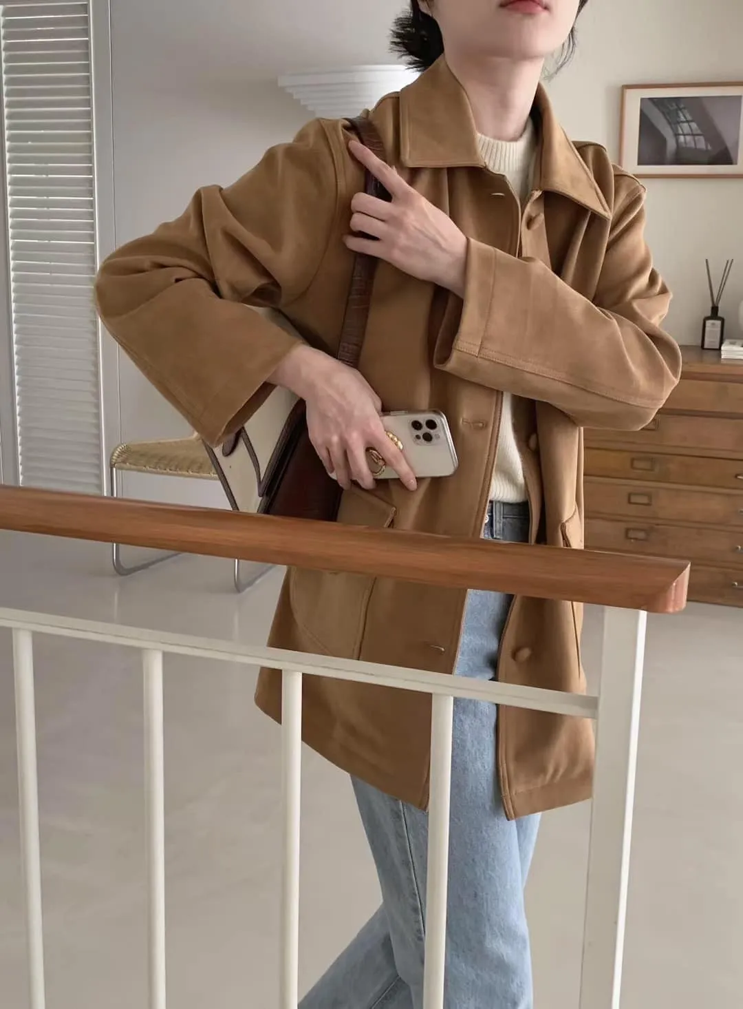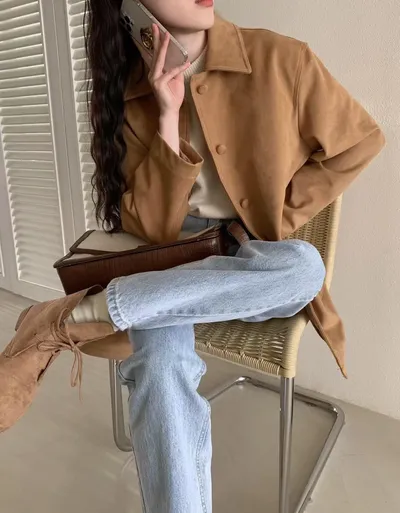 麂皮外套,今年秋冬必須來一件 濃厚的復古休閒感 跟牛仔,蕾絲單品真的百搭 厚度適中,很理想的日常外套 這件是合肩線的、穿起來修身又俐落 可以遮到屁股的衣長 更加實穿 有內裡 這件闆娘覺得價格很不錯 焦糖棕色真的好好看 推薦 Made in Korea