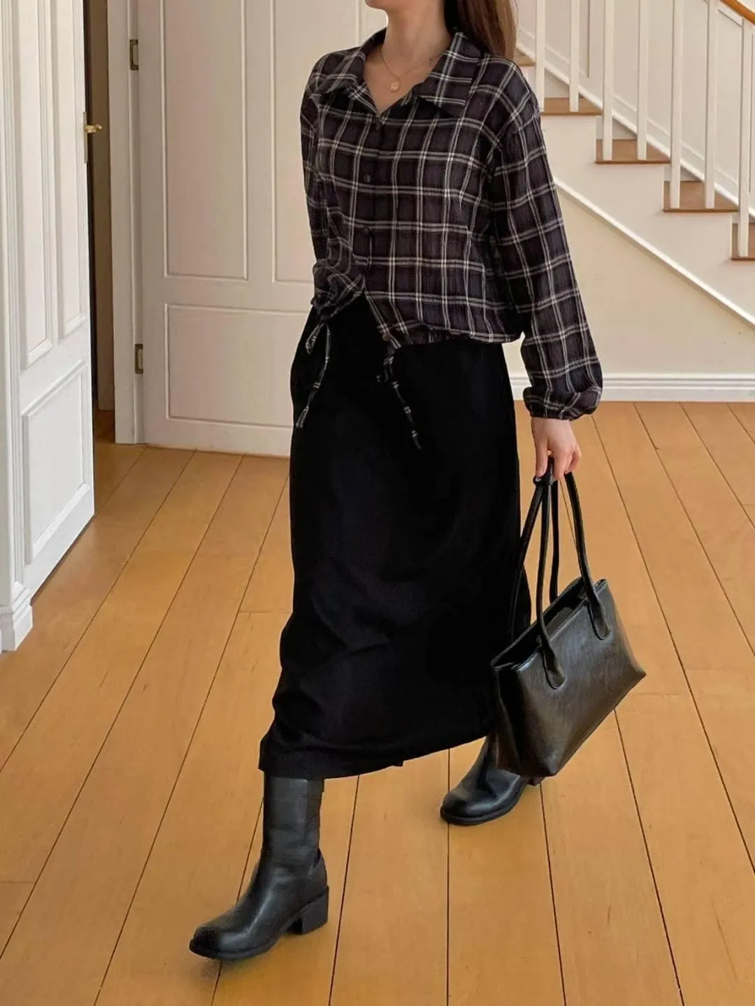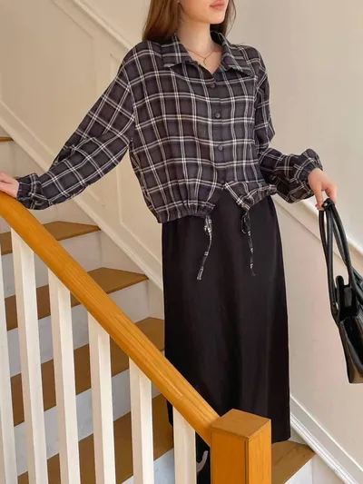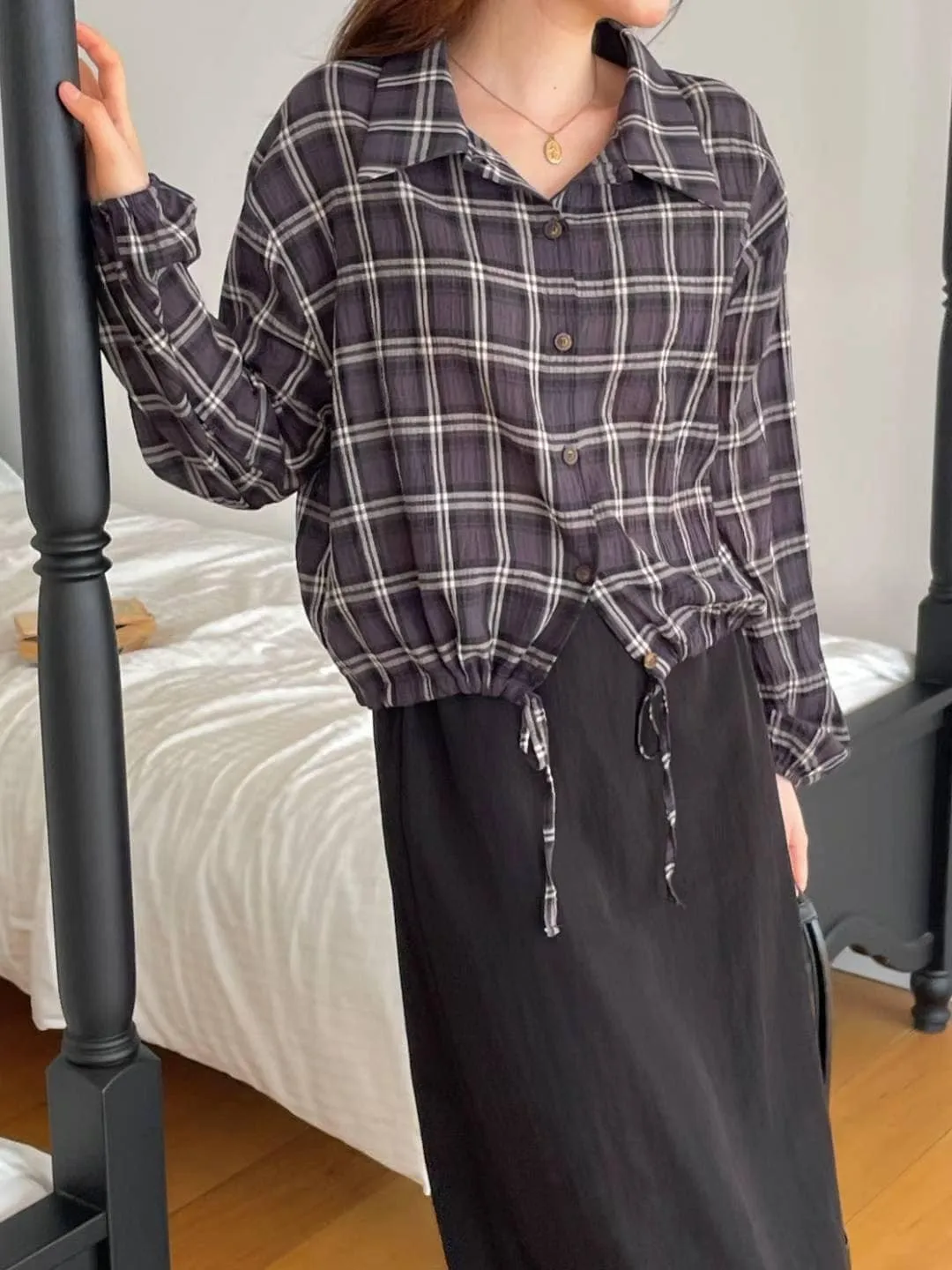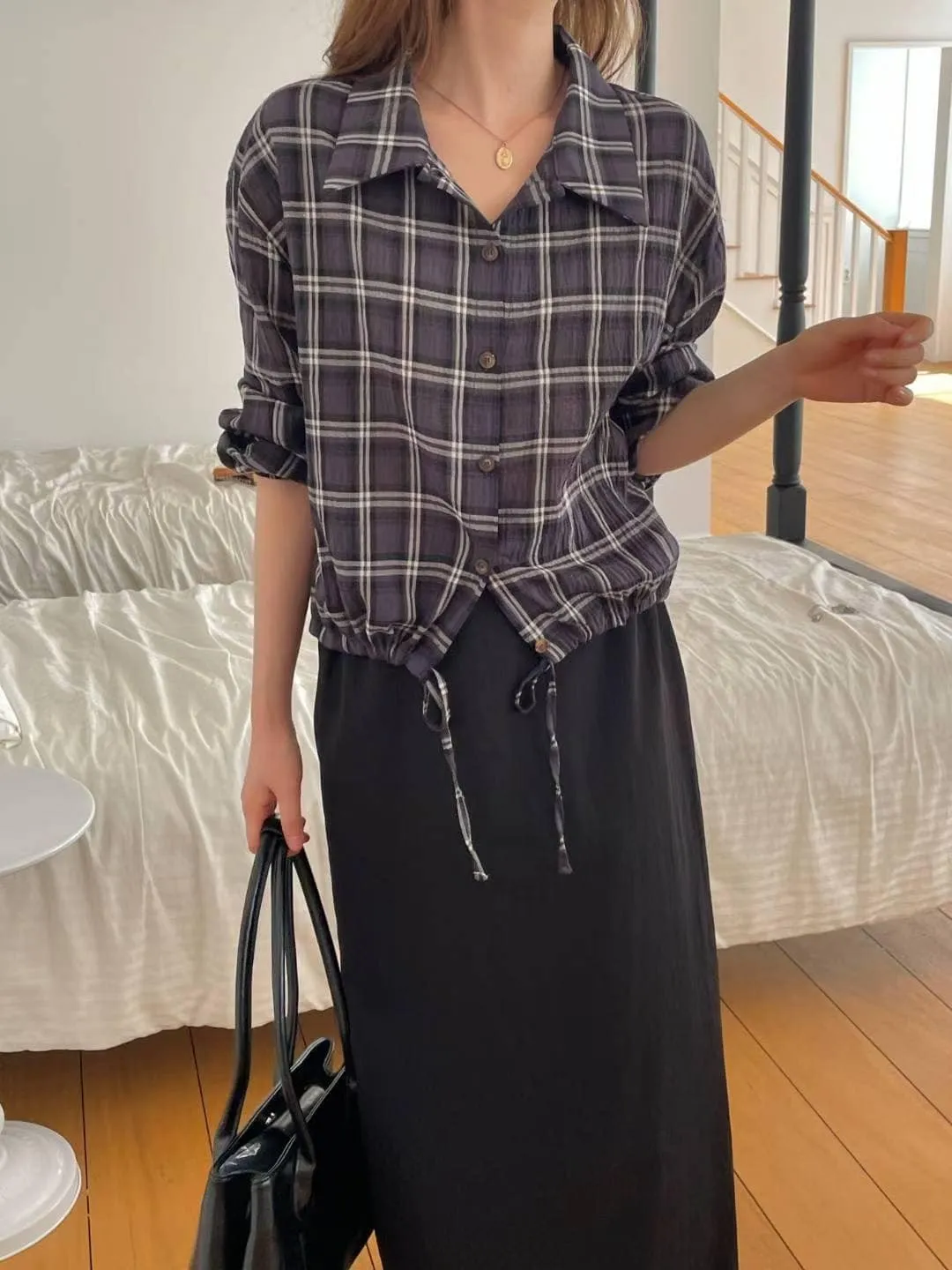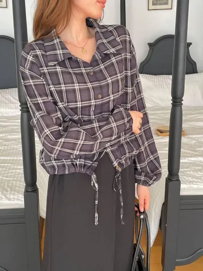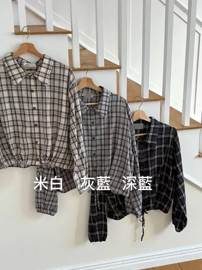 OC529 正韓 下綁帶格紋襯衫F 深藍現貨